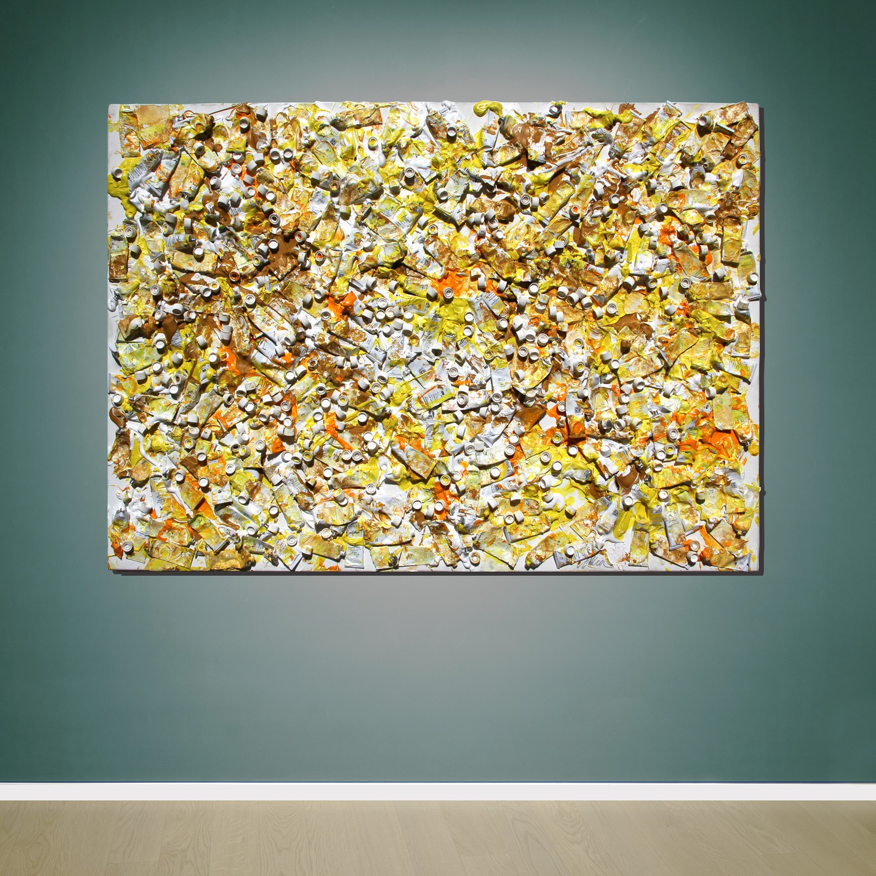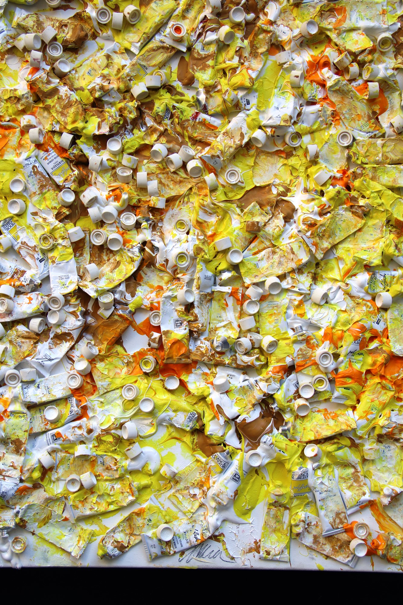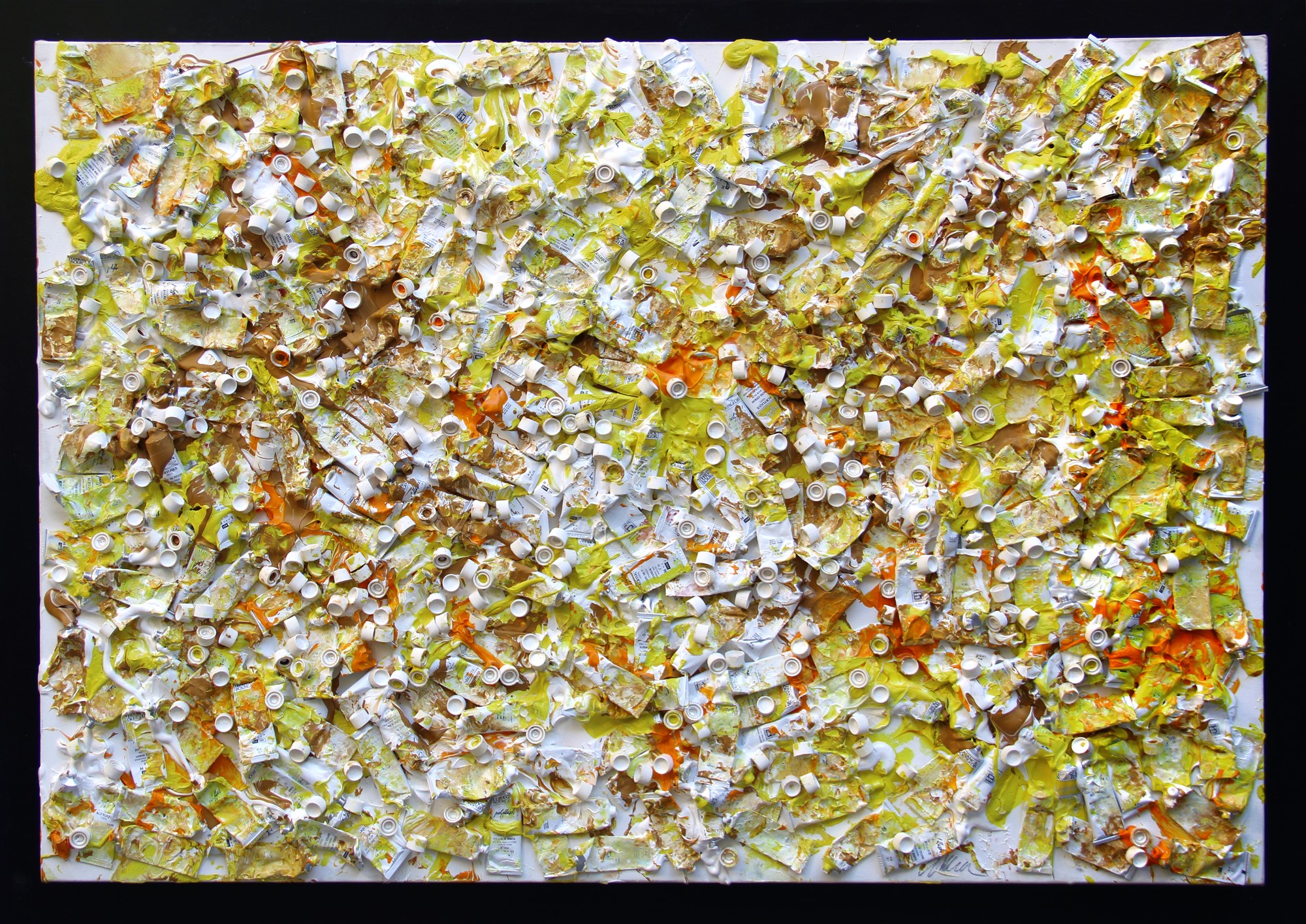 Senza titolo, 1989, accumulazione di tubetti di colore, tappi e acrilico su tela, cm 90x130