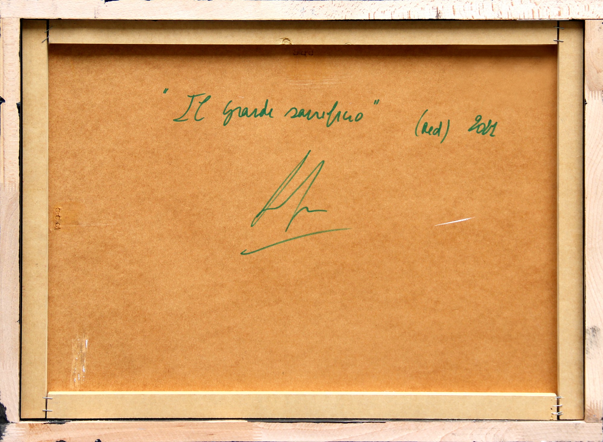 Titolo, data, firma "Il grande sacrificio (red), 2021, Puglisi" (al retro)