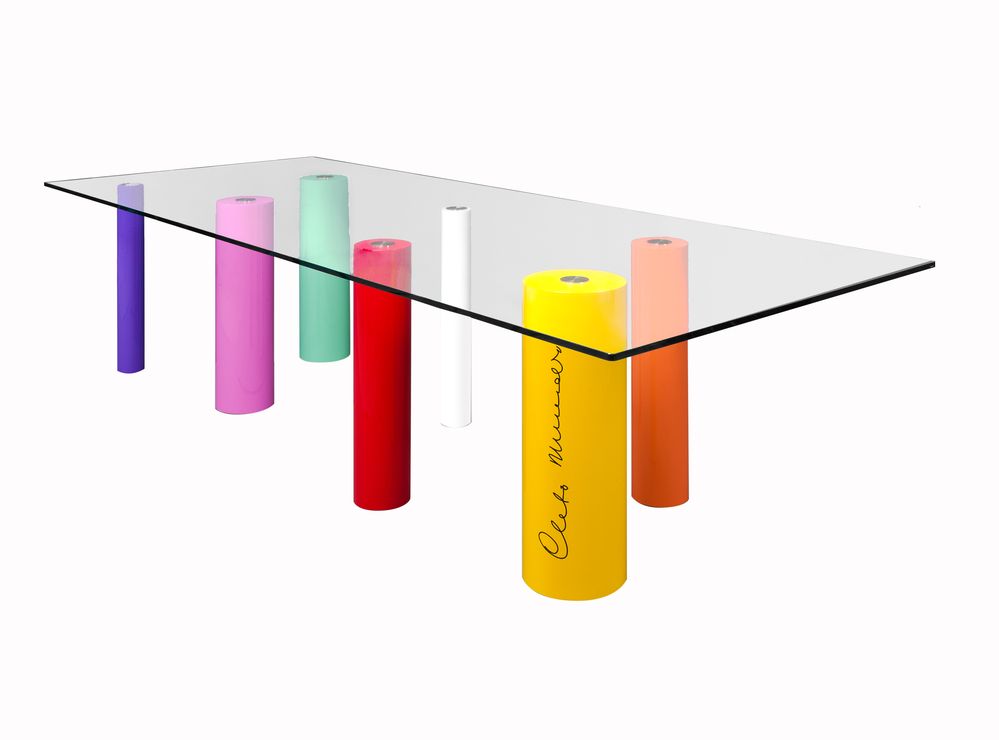 CLETO MUNARI Tavolo con gambe in legno rivestite in PVC e piano in cristallo extrachiaro temperato modello 'Palafitte'. Edizione di 99 esemplari. Firma dell'artista. Prod. Cleto Munari, Italia, 2008 Cm 74x300x120