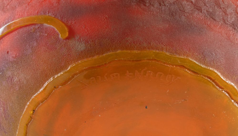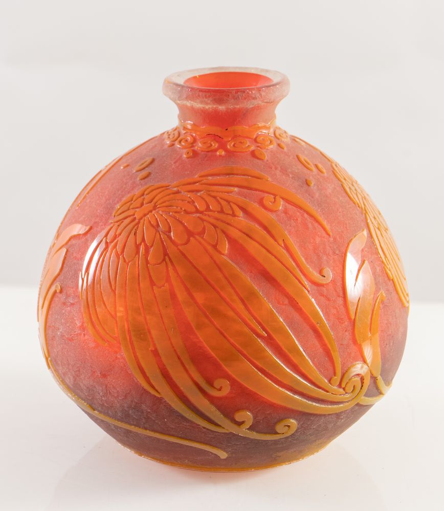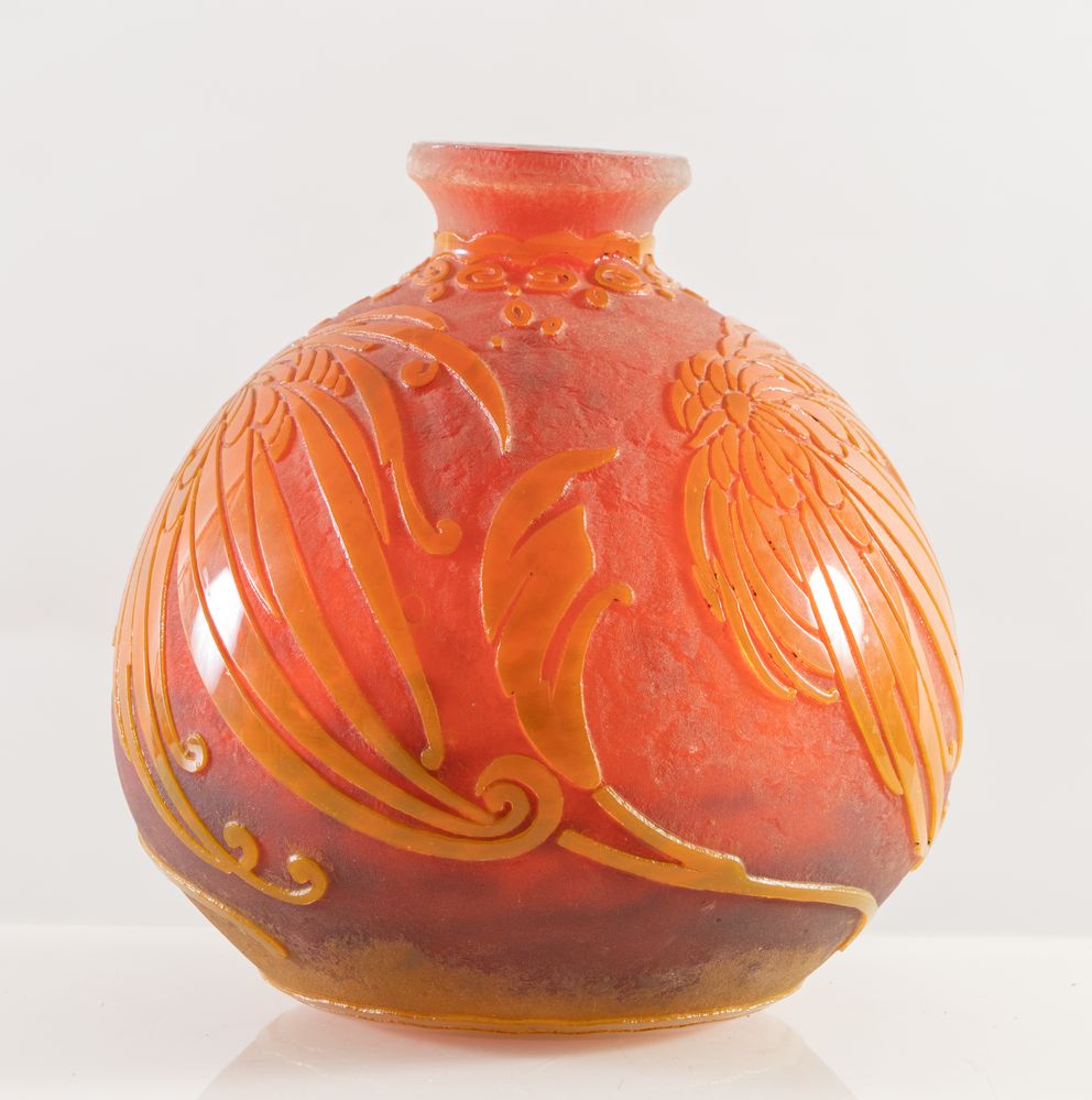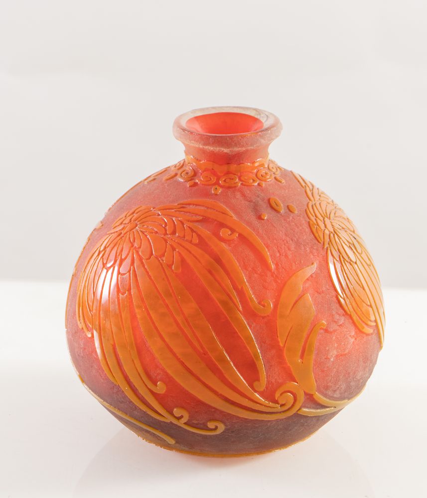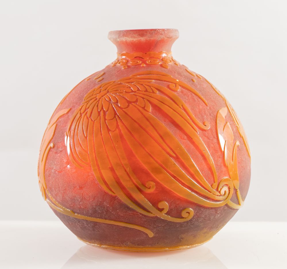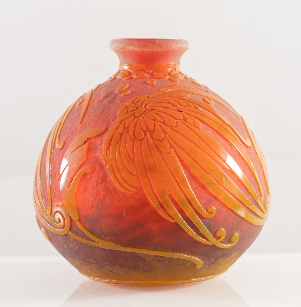 Lot 226 | DAUM & NANCY Vaso in vetro a cammeo soffiato con decori floreali crisantemi a smalti policromi. Firma incisa ad acido. Prod. Daum & Nancy, Francia, 1900 ca. Cm 20x20x20
