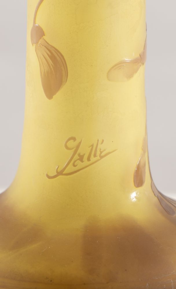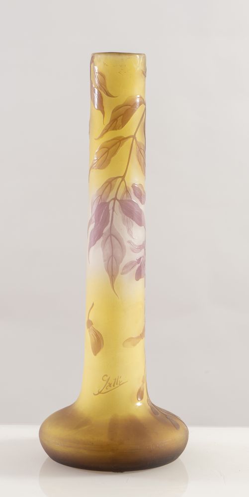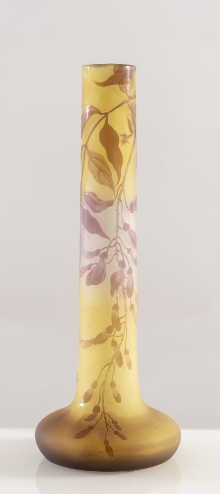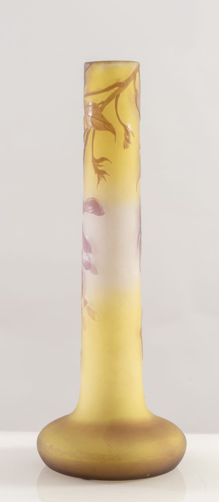 EMILE GALLE' Vaso in vetro a cammeo soffiato con decori floreali. Firma incisa ad acido. Prod. Gallè, Francia, 1900 ca. Cm 35x13x13