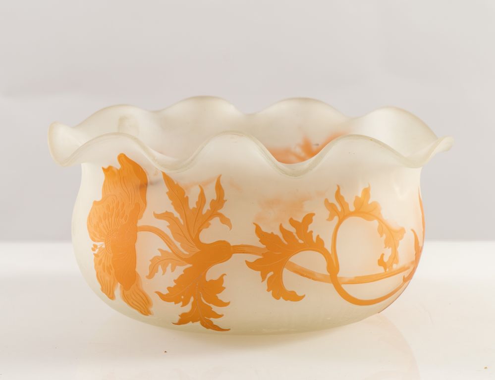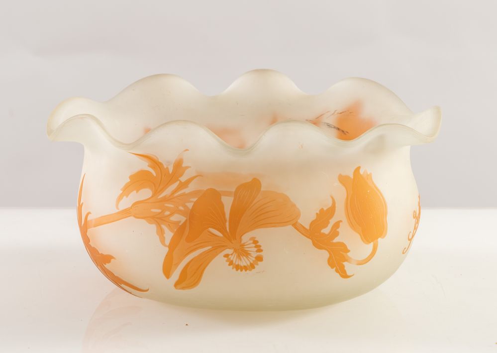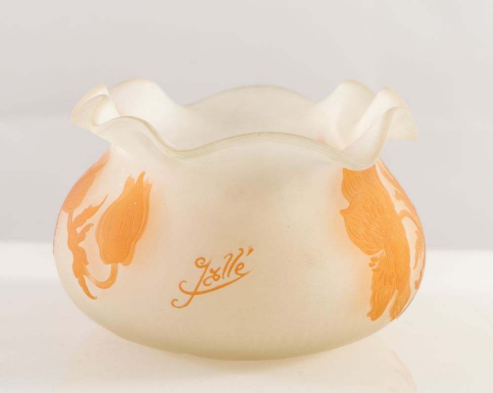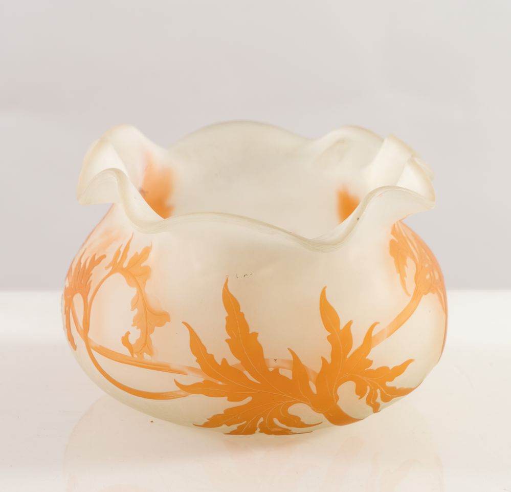 EMILE GALLE' Centrotavola in vetro a cammeo soffiato con decori floreali. Firma incisa ad acido. Prod. Gallè, Francia, 1900 ca. Cm 12x24x16