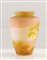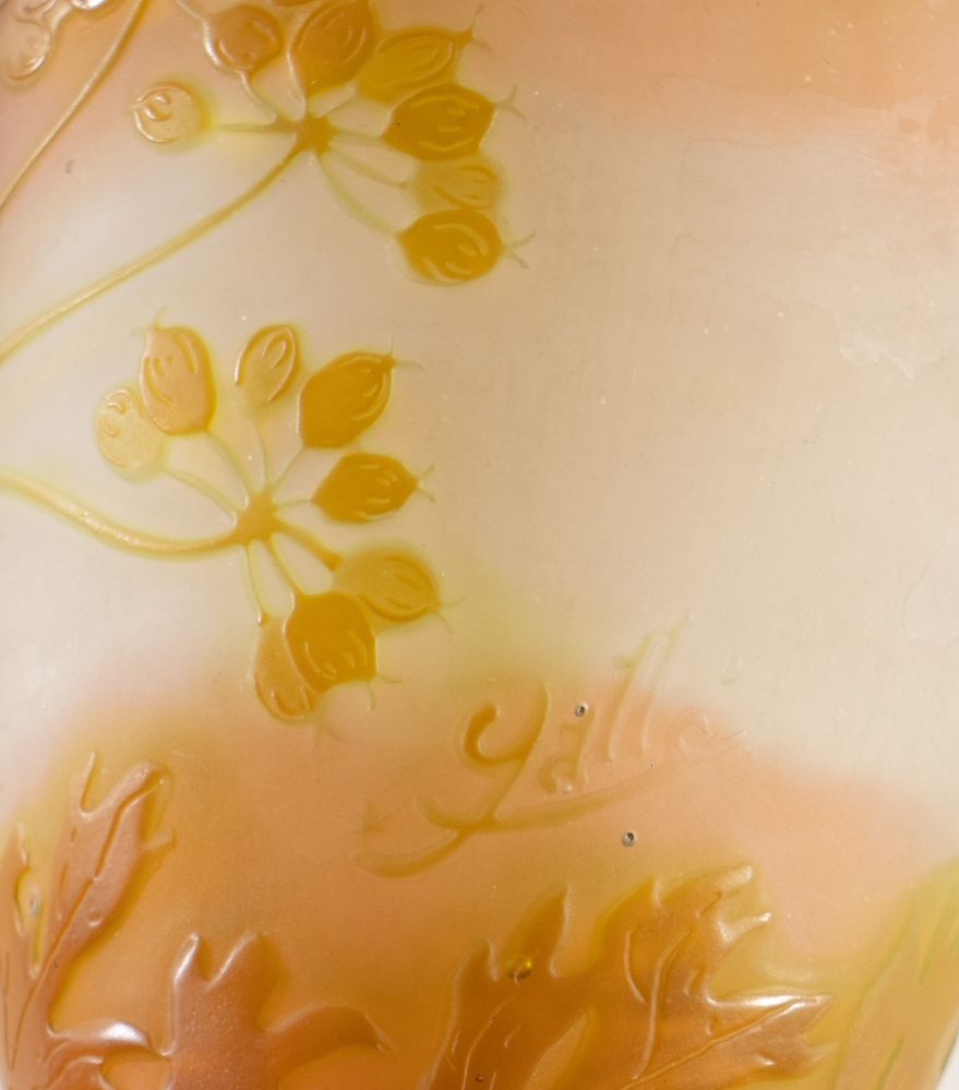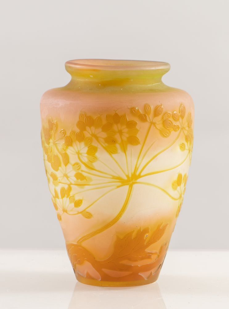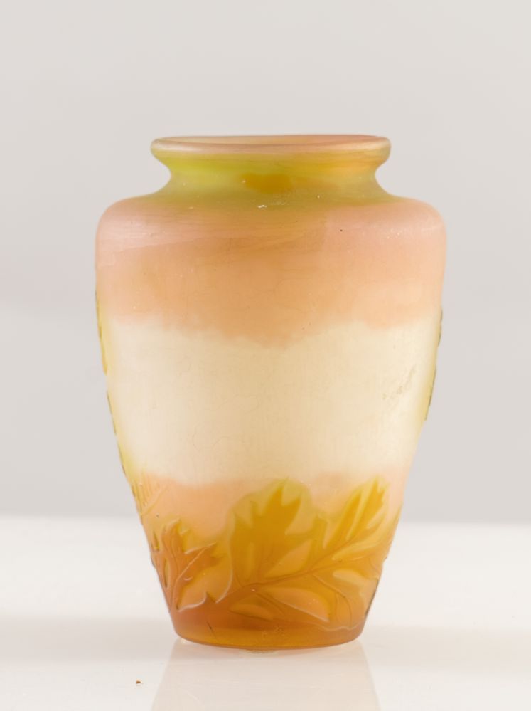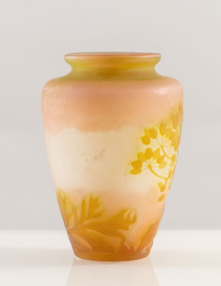 EMILE GALLE' Vaso in vetro a cammeo soffiato con decori floreali. Firma incisa ad acido. Prod. Gallè, Francia, 1900 ca. Cm 12x9x9