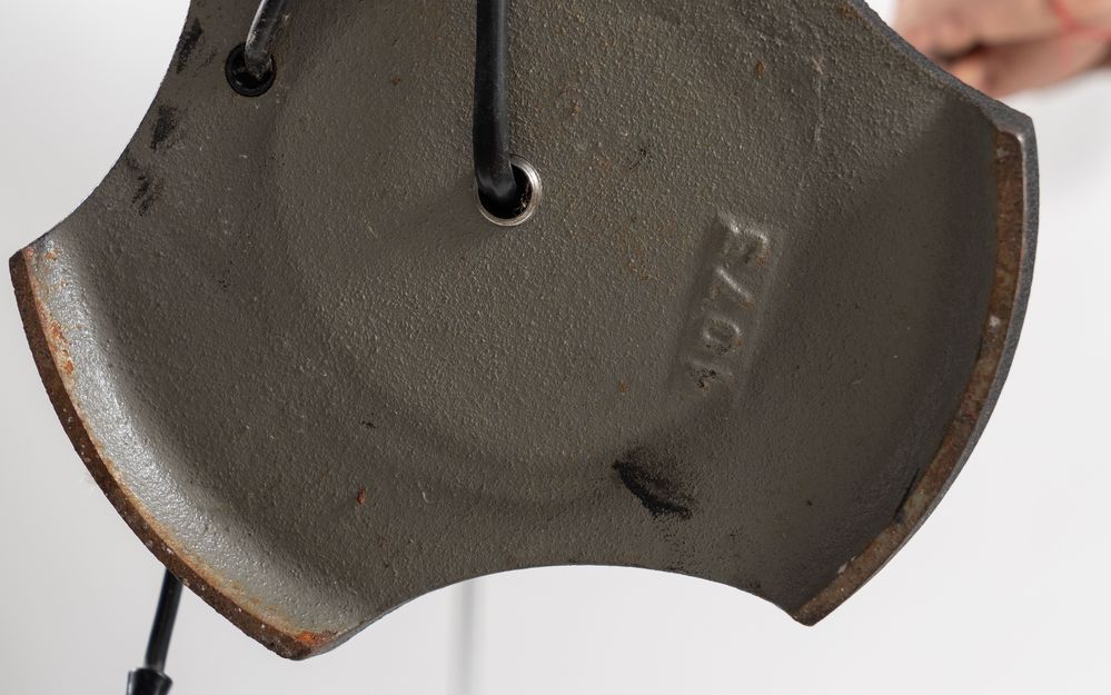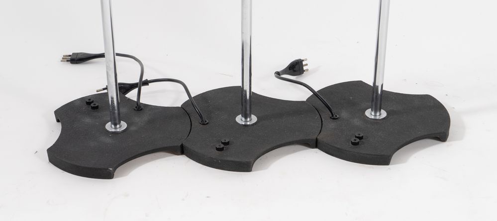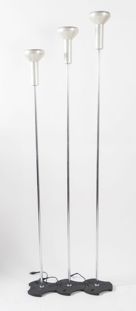 GINO SARFATTI Tre lampade modello 1073/3 in acciaio, alluminio e base in metallo craquelé. Prod. Arteluce, Italia, 1956 Cm 207x24x24 (grande) Cm 198x24x24 (media) Cm 183x24x24 (piccola)