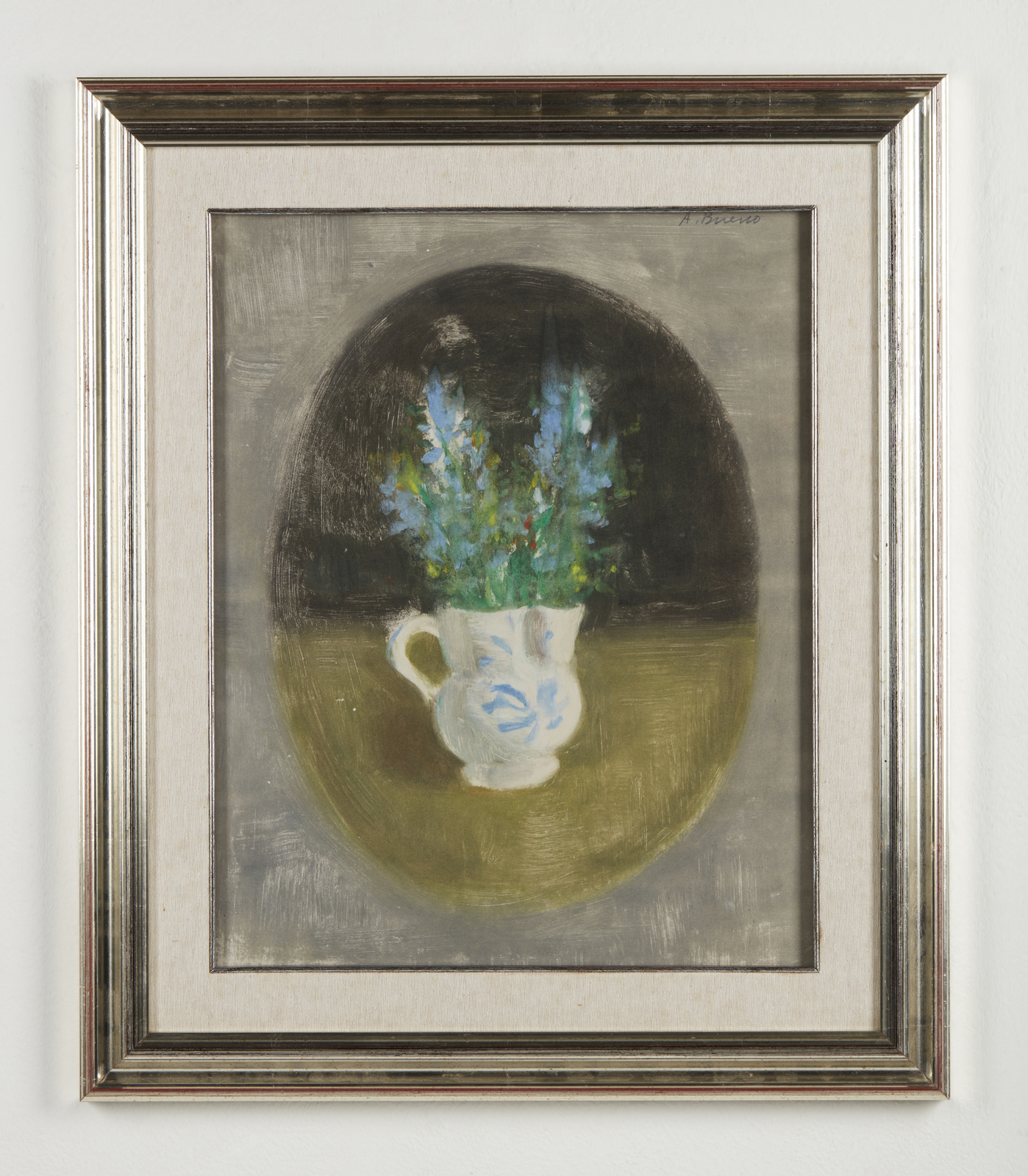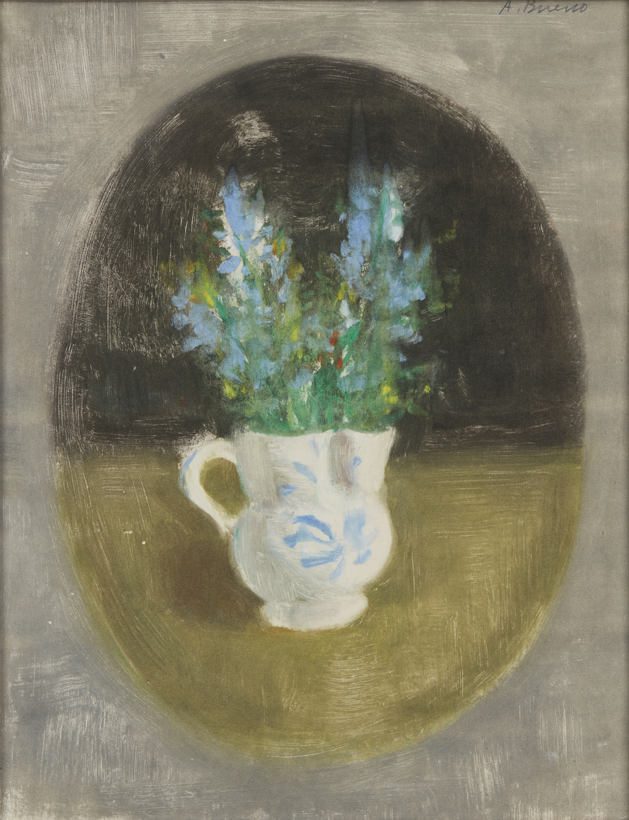 BUENO ANTONIO (1918 - 1985) Caraffa con fiori in ovale. Tecnica mista su carta intelata. Cm 40,00 x 50,00. Firma in alto a destra. Opera archiviata presso l'Archivio Antonio Bueno - Giovanbattista Bianco, come da documentazione fotografica allegata all'opera riportante il relativo numero d'inventario. . Cornice presente