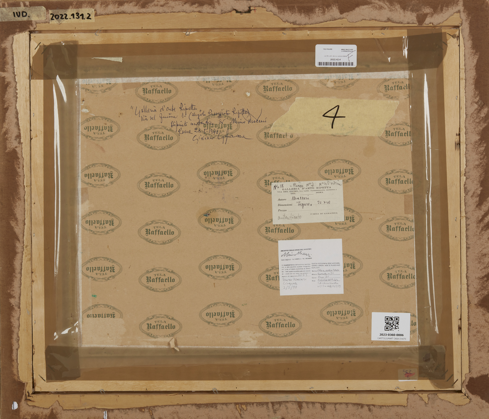 MACCARI MINO (1898 - 1989) Senza titolo. Olio su cartone telato. Cm 50,00 x 40,00. Firma in basso a destra. Al retro cartigli descrittivi Archivio Mino Maccari, Cinquale e Galleria Ripetta, Roma. Opera archiviata presso l'Archivio delle opere del Maestro Mino Maccari, Cinquale, come da documentazione fotografica allegata all'opera riportante il relativo numero d'inventario. Autentica su fotografia con timbri Archivio Mino Maccari, Roma, a cura di Raymond John Charlton e timbro Galleria A. Consorti, Roma. Autentica dell'artista su fotografia con timbro Galleria A. Consorti, Roma. Anni '70. Cornice presente