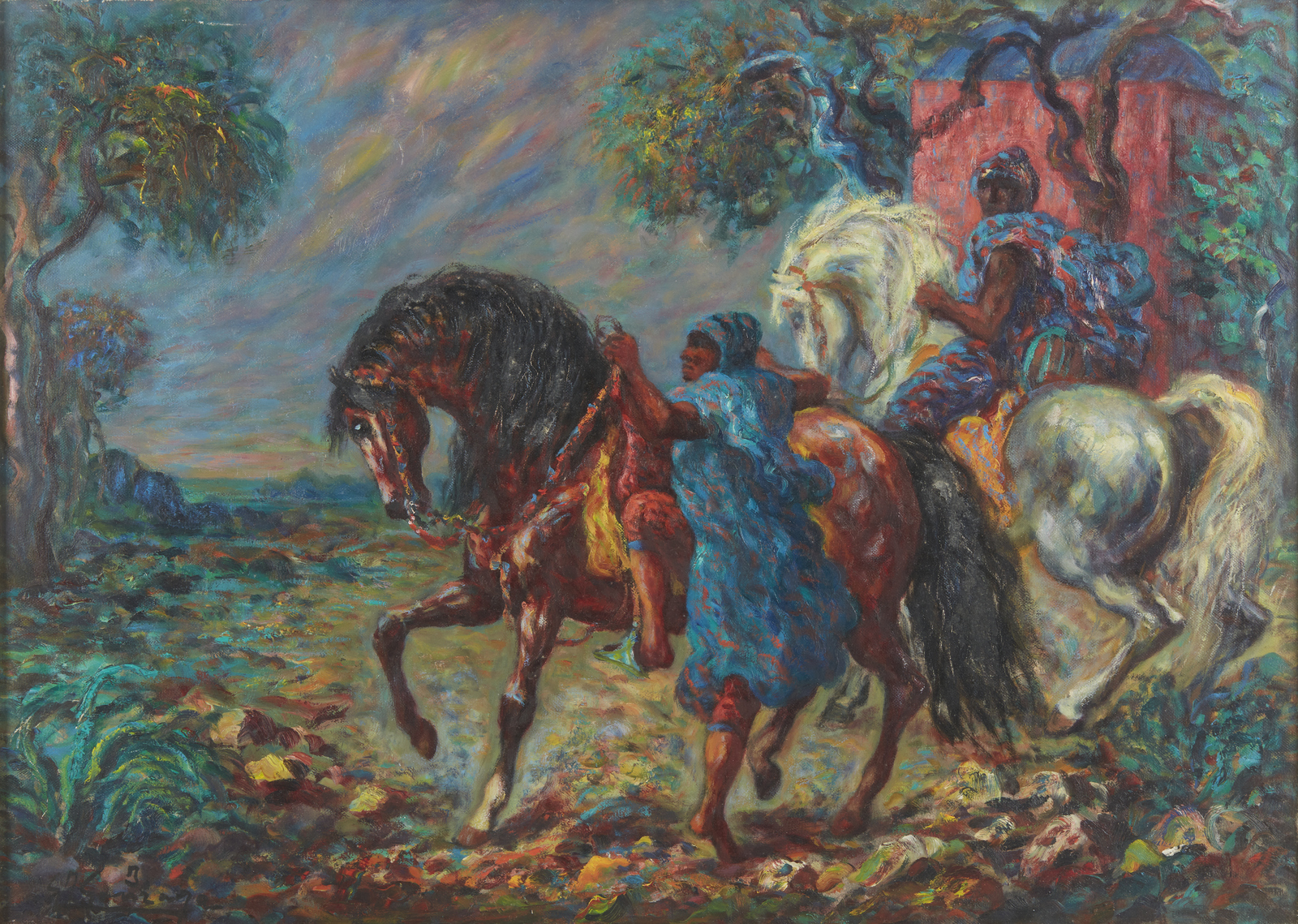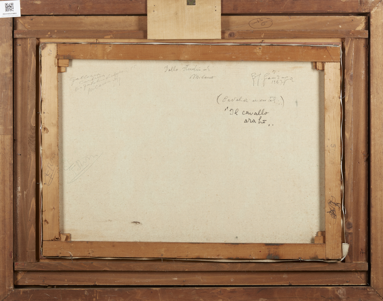 GONZAGA GIOVANFRANCESCO (1921 - 2007) Il cavallo arabo. . 1967. Olio su tela . Cm 70,00 x 50,00. Firma in basso a sinistra. Al retro titolo, firma e anno. Provenienza: Studio dell'artista, Milano; Galleria Cortina, Milano; Collezione privata, Brescia. Difetti. Cornice presente