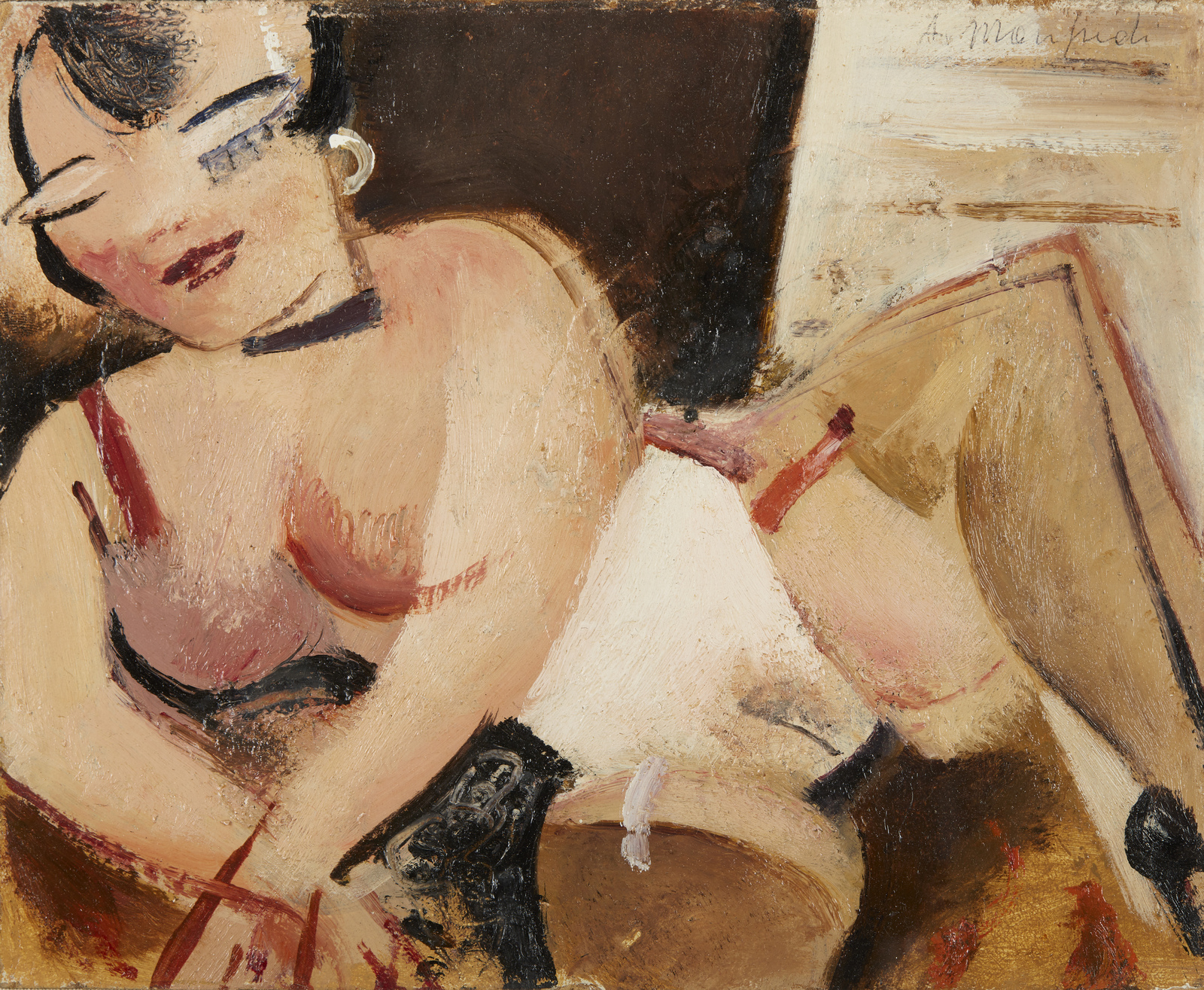 MANFREDI ALBERTO (1930 - 2001) Senza titolo. 1971. Olio su masonite. Cm 20,00 x 18,00. Firma in alto a destra. Al retro firma e anno. Opera in corso di archiviazione presso l'Archivio Alberto Manfredi. Provenienza: Galleria Pananti, Firenze; Collezione privata, Empoli. Lievi difetti. Cornice presente