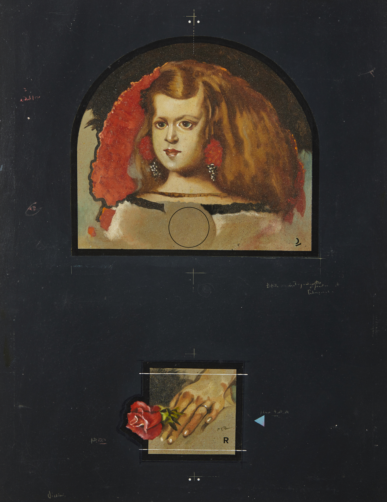VIZZINI ANDREA (n. 1949) Las Maninas (Ritestualizzazione). . 1979. Tecnica mista su tela. Cm 70,00 x 90,00. Firma in basso a sinistra. Al retro titolo, firma e timbro dell'artista con relativo numero d'inventario. Autentica dell'artista su fotografia riportante il relativo numero d'inventario. Lievi difetti. Cornice presente