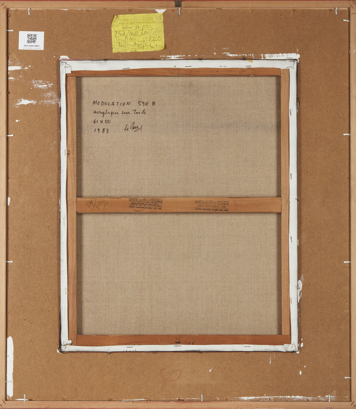 LE PARC JULIO (n. 1928) Modulation 590 B. 1983. Acrilico su tela. Cm 50,00 x 61,00. Al retro titolo, firma, anno, cartiglio descrittivo e timbri Studio F.22, Palazzolo. Autentica dell'artista su fotografia. Provenienza: Studio F22, Palazzolo; Collezione privata, Brescia. . Cornice presente