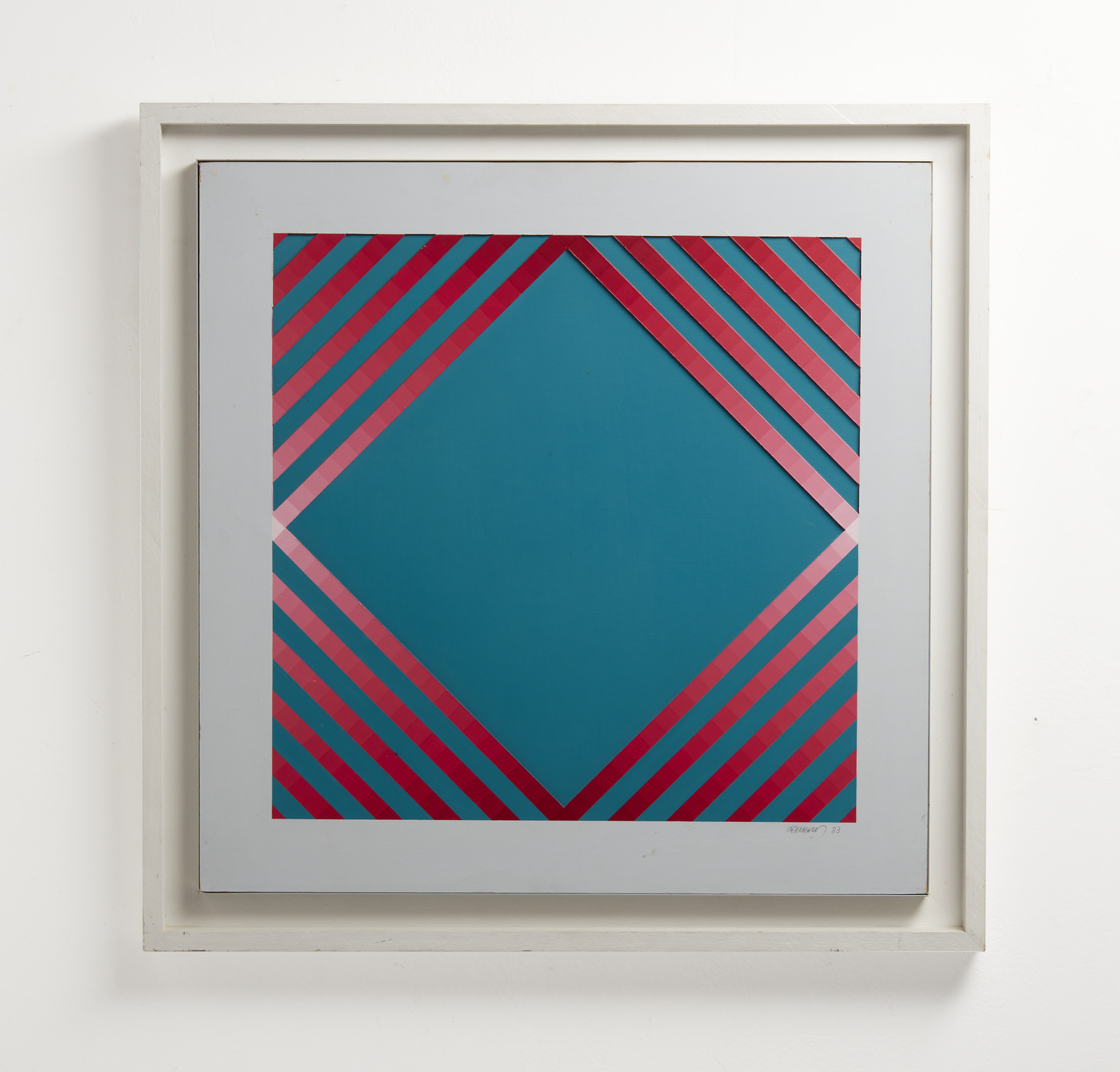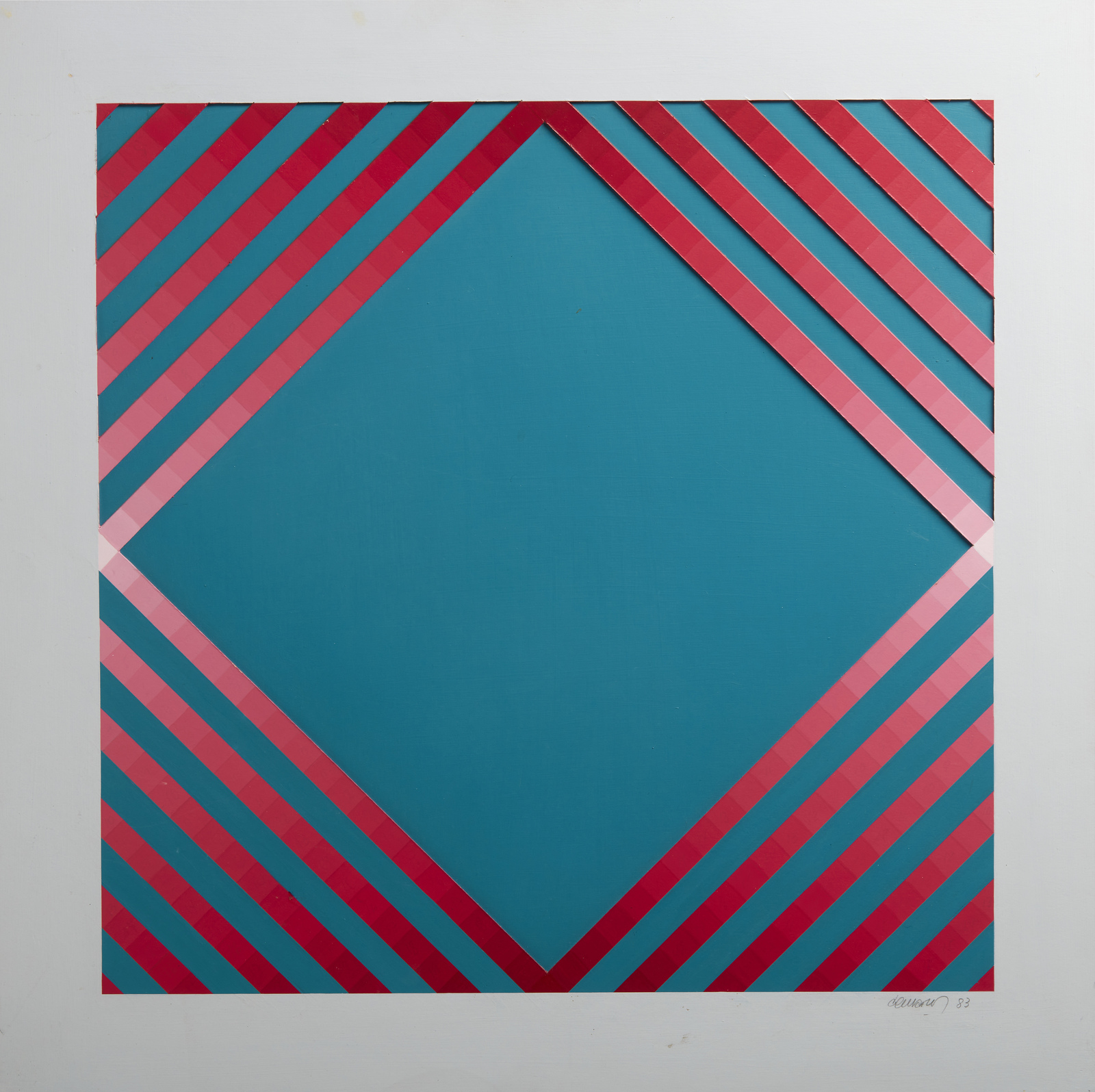 DE MARCO HUGO RODOLFO (1932 - 1995) Senza titolo. 1983. Tecnica mista e collage su tavola. Cm 50,00 x 50,00. Firma e anno in basso a destra. Al retro cartiglio descrittivo Fidesarte. Certificato di provenienza e garanzia Studio Martini, Brescia. Lievi difetti. Cornice presente