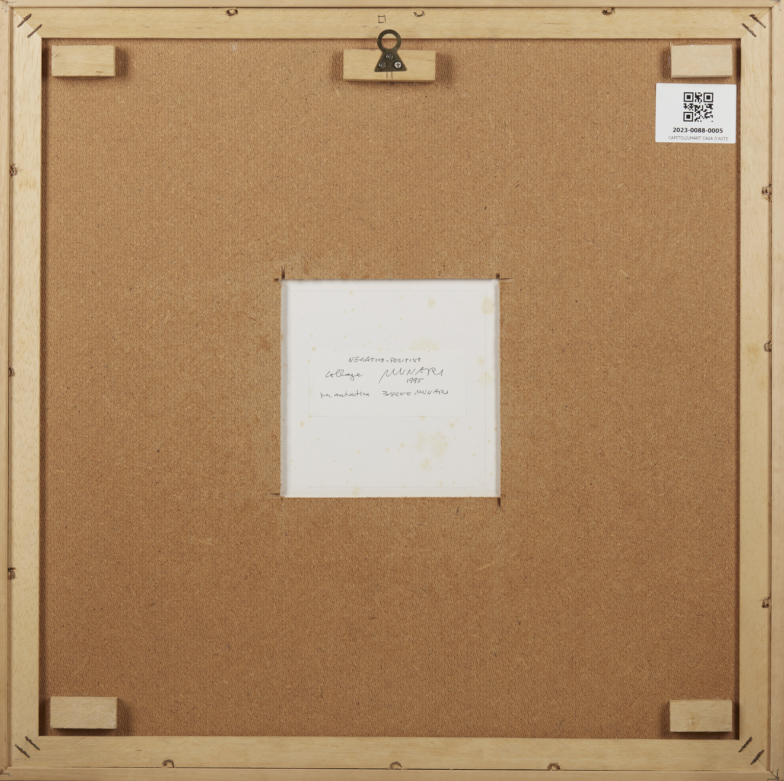 MUNARI BRUNO (1907 - 1998) Negativo - positivo. 1995. Tecnica mista e collage su carta. Cm 30,00 x 30,00. Al retro titolo, firma, anno e firma per autentica. Lievi difetti. Cornice presente