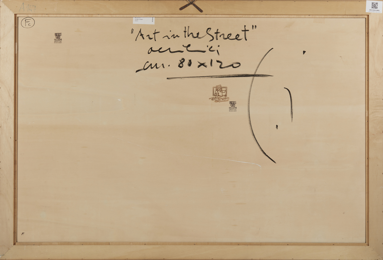 NESPOLO UGO (n. 1941) Art in the Street,. Acrilico su tavola. Cm 120,00 x 80,00. Firma in alto a sinistra. Al retro titolo, firma e timbro Elleni Galleria d'arte, Bergamo. Provenienza: Collezione privata, Bergamo. Autentica dell'artista su fotografia. Cornice presente