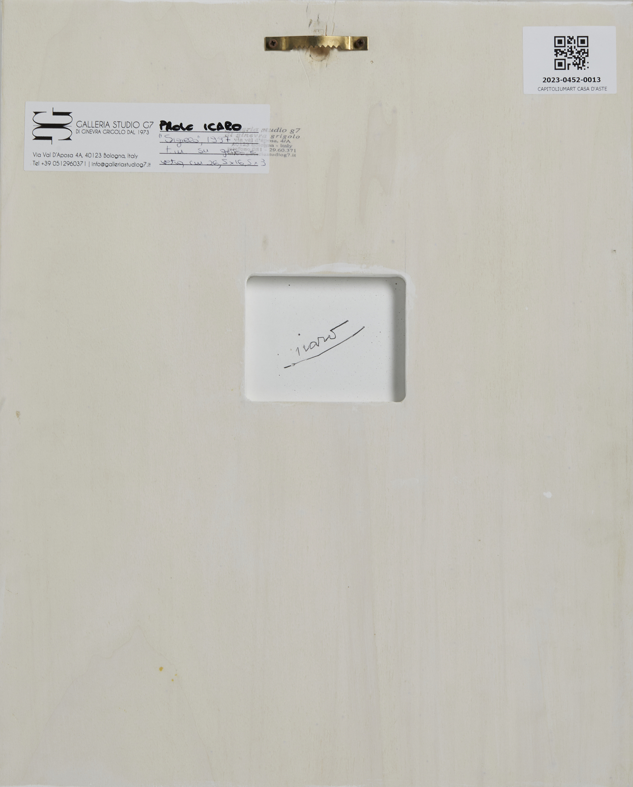 ICARO PAOLO (n. 1936) Sigillo. 1997. Gesso. Cm 16,50 x 26,50 x 3,00. Al retro firma, cartiglio descrittivo e timbro Galleria Studio G7, Bologna. Esposizione: Arredo Internet, Galleria Studio G7, Bologna, 1997. Certificato di provenienza Galleria Studio G7, Bologna. Provenienza: Studio G7, Bologna; Collezione privata, Bologna. Entro teca in plexiglass. Cornice presente