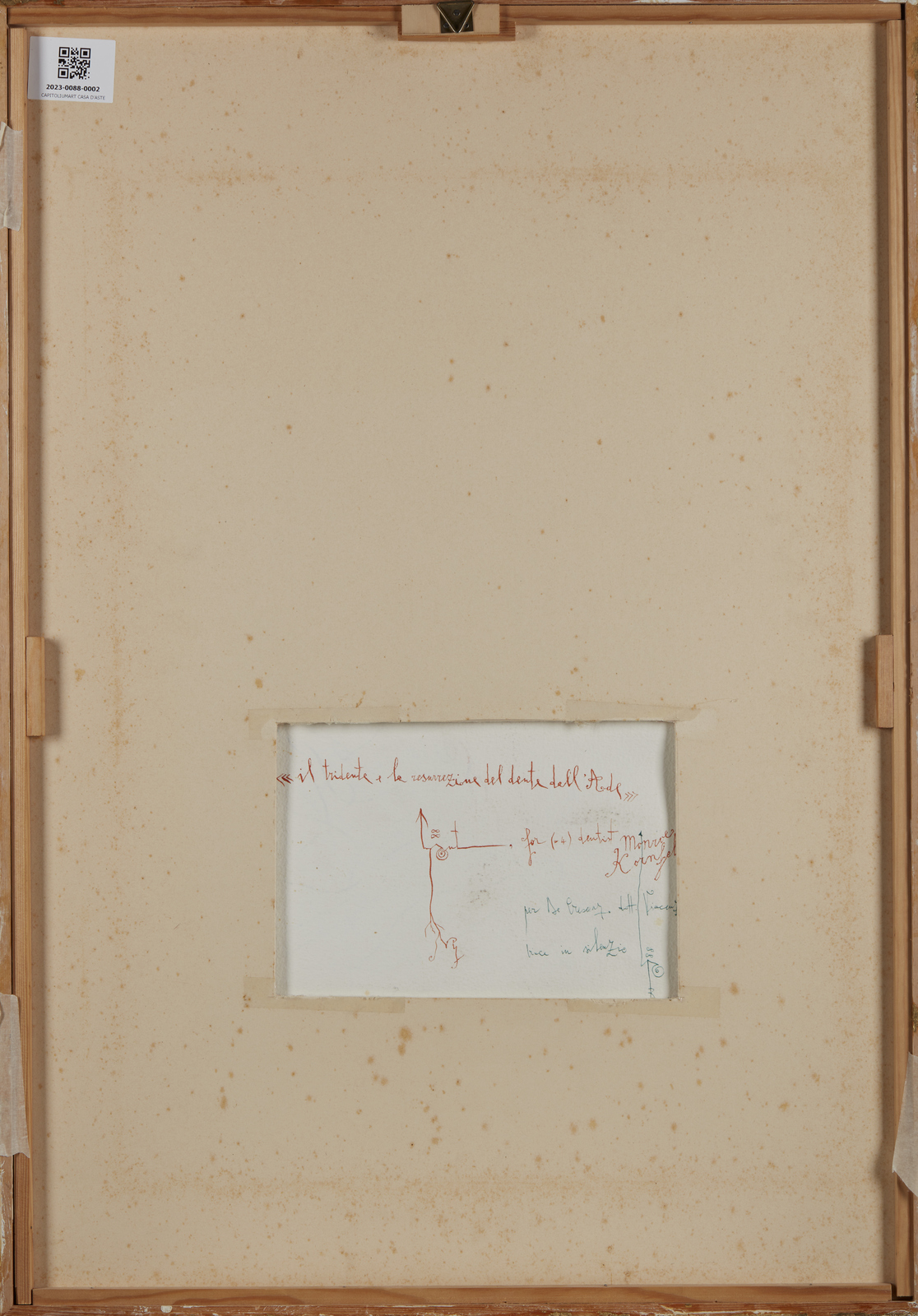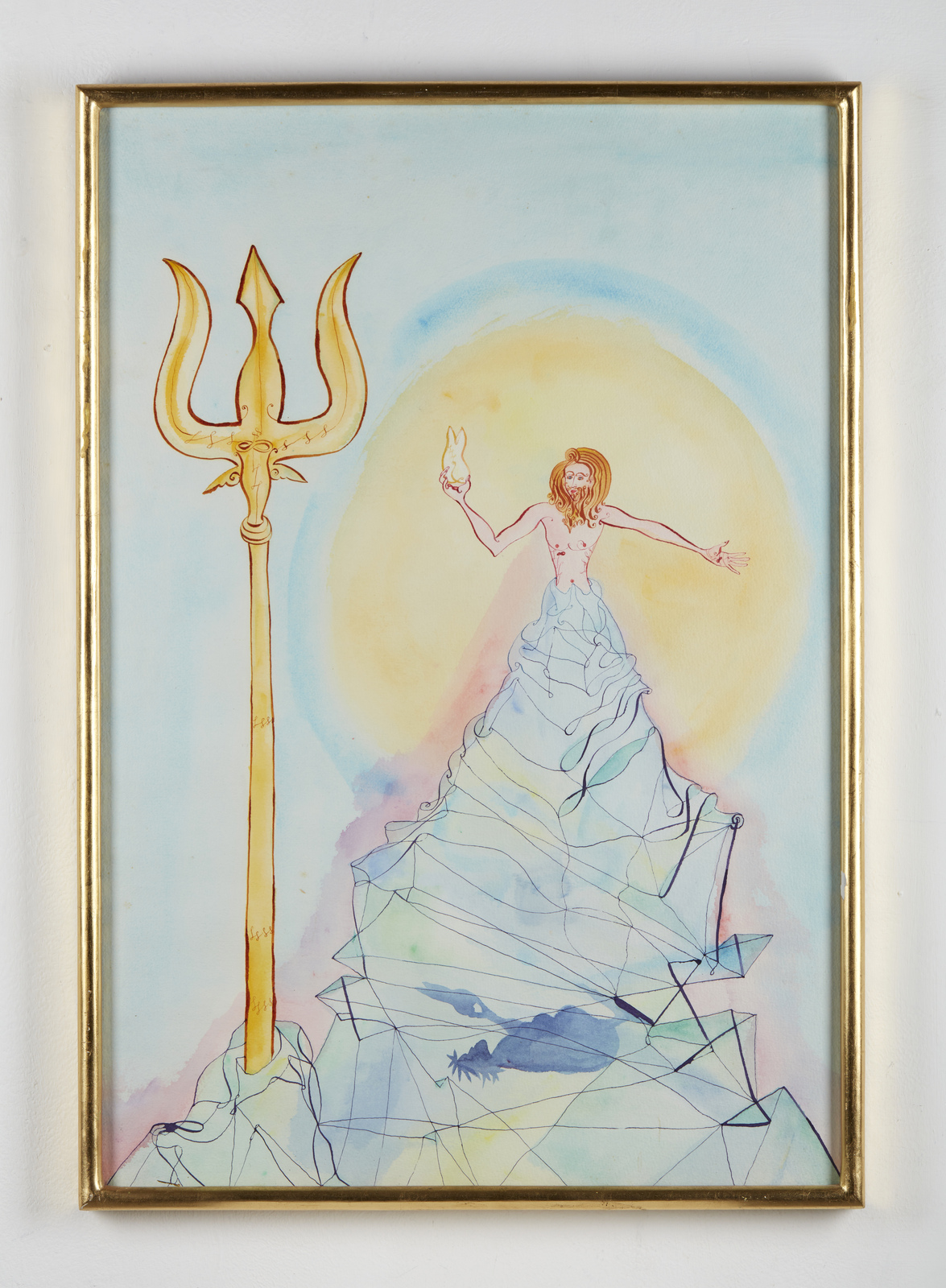 ONTANI LUIGI (n. 1943) Il tridente e la resurrezione del dente dall'Ade. 1988. Tecnica mista su carta. Cm 55,00 x 80,00. Al retro titolo, firma, dedica e anno. Provenienza: Galleria Astuni, Fano; Collezione privata, Massa. Cornice presente