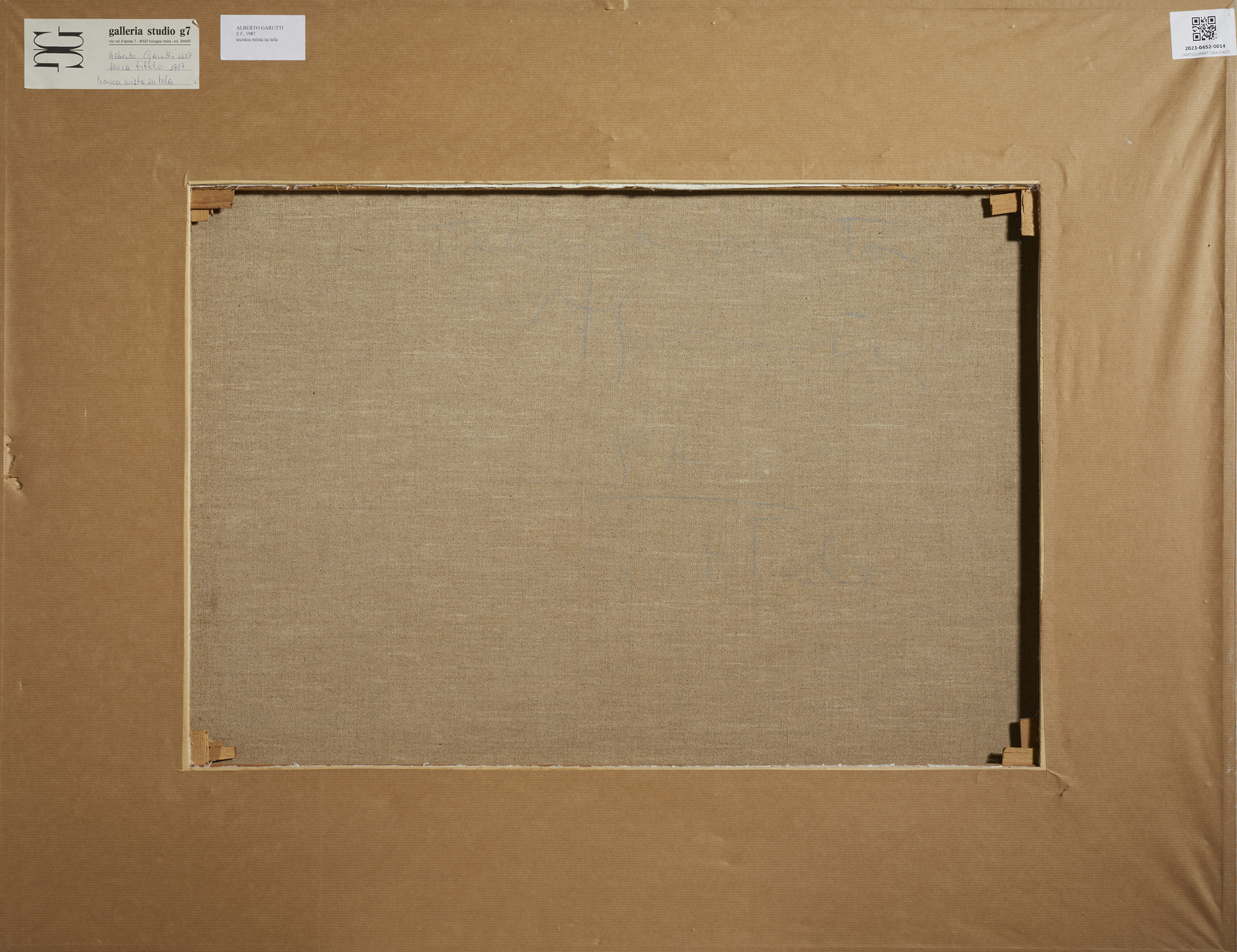 GARUTTI ALBERTO (n. 1948) Senza titolo. 1987. Tecnica mista su tela. Cm 80,00 x 57,00. Al retro firma e cartiglio descrittivo Studio G7, Bologna. Autentica dell'artista su fotografia. Certificato di provenienza Studio G7, Bologna. Provenienza: Studio G7, Bologna; Collezione privata, Bologna. Esposizioni: Alberto Garutti e Paolo Icaro, Studio G7, Bologna, 1988; My way, A modo mio. Ginevra Grigolo e lo Studio G7, 44 anni tra attività e ricerca, MAMbo, 30 Aprile - 28 Maggio, 2017. . Cornice presente
