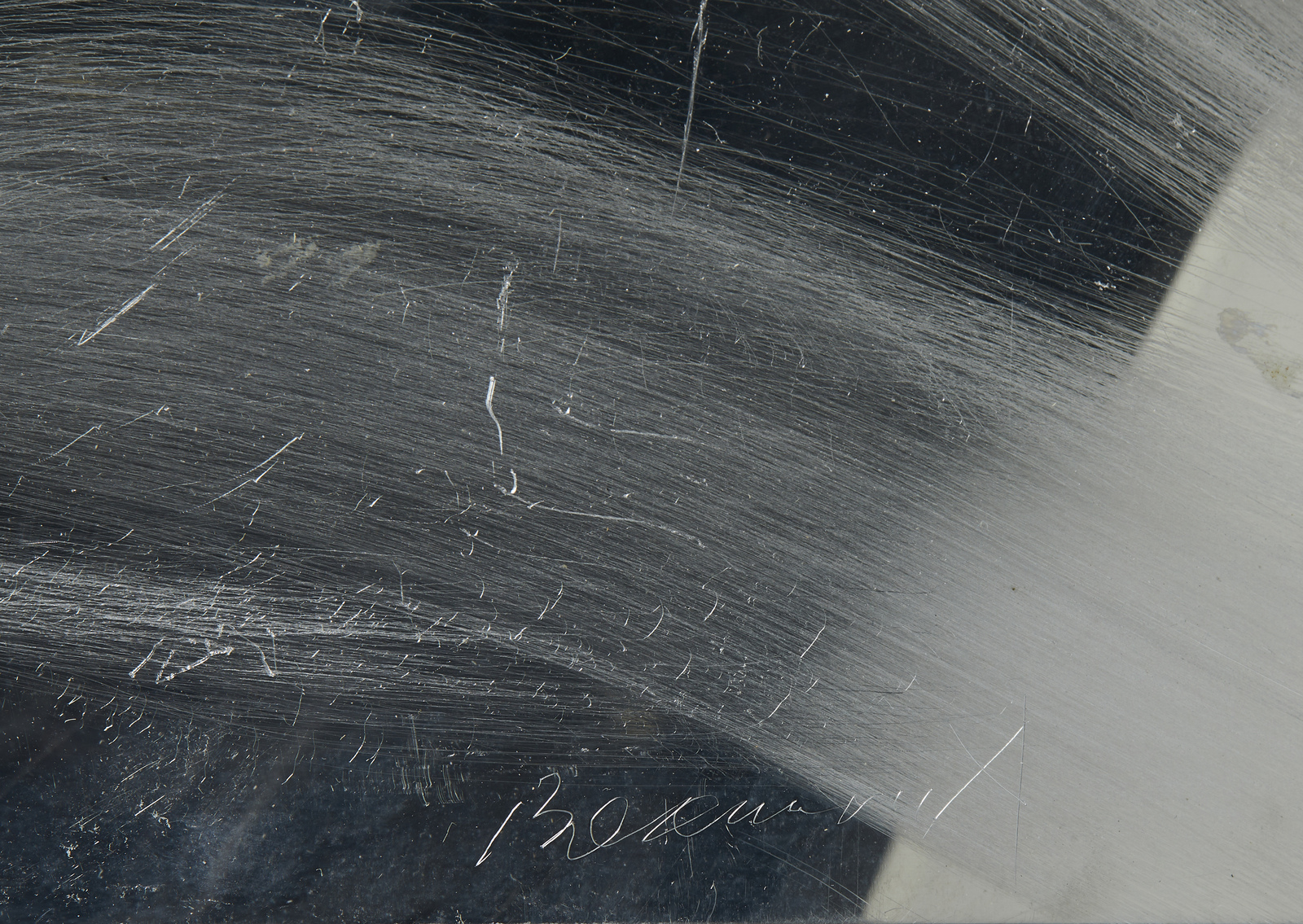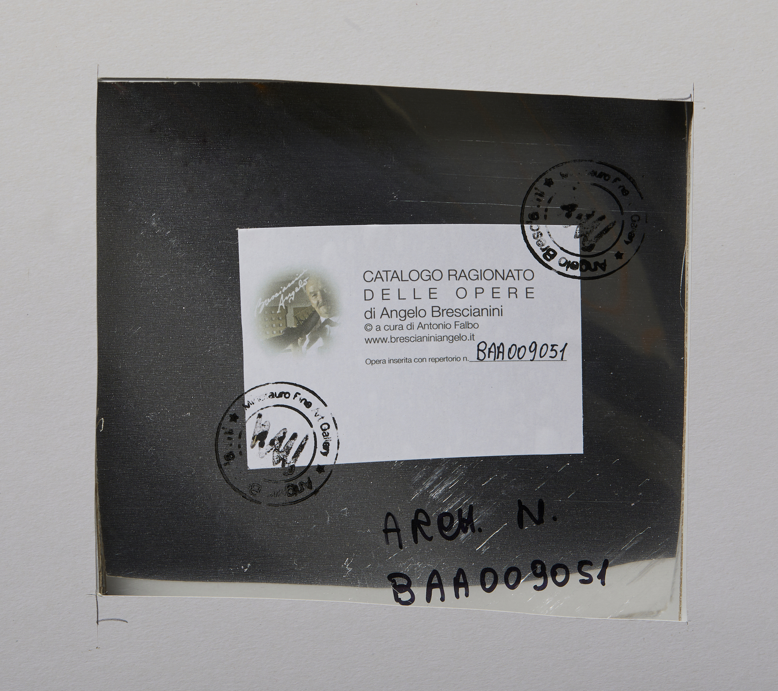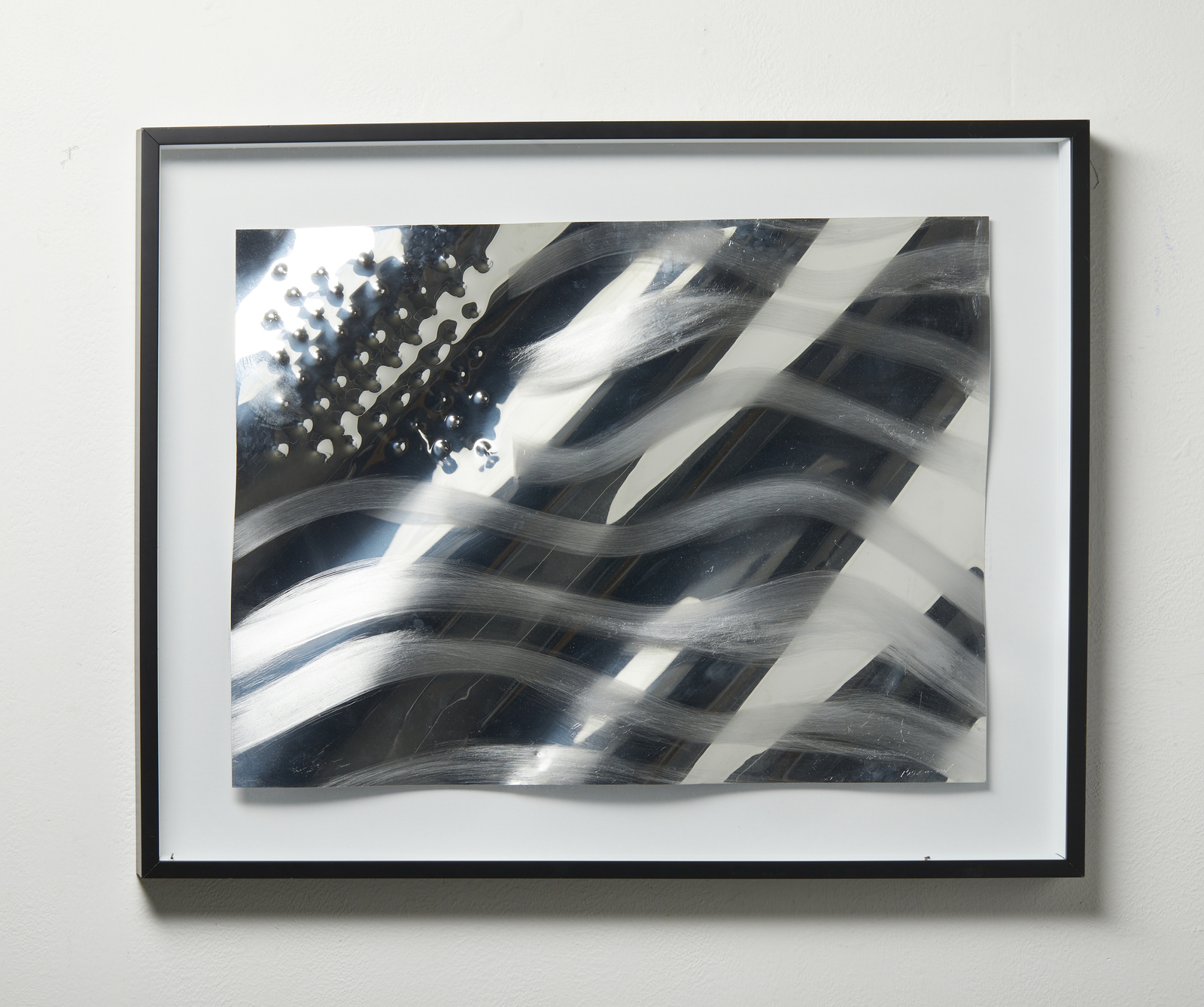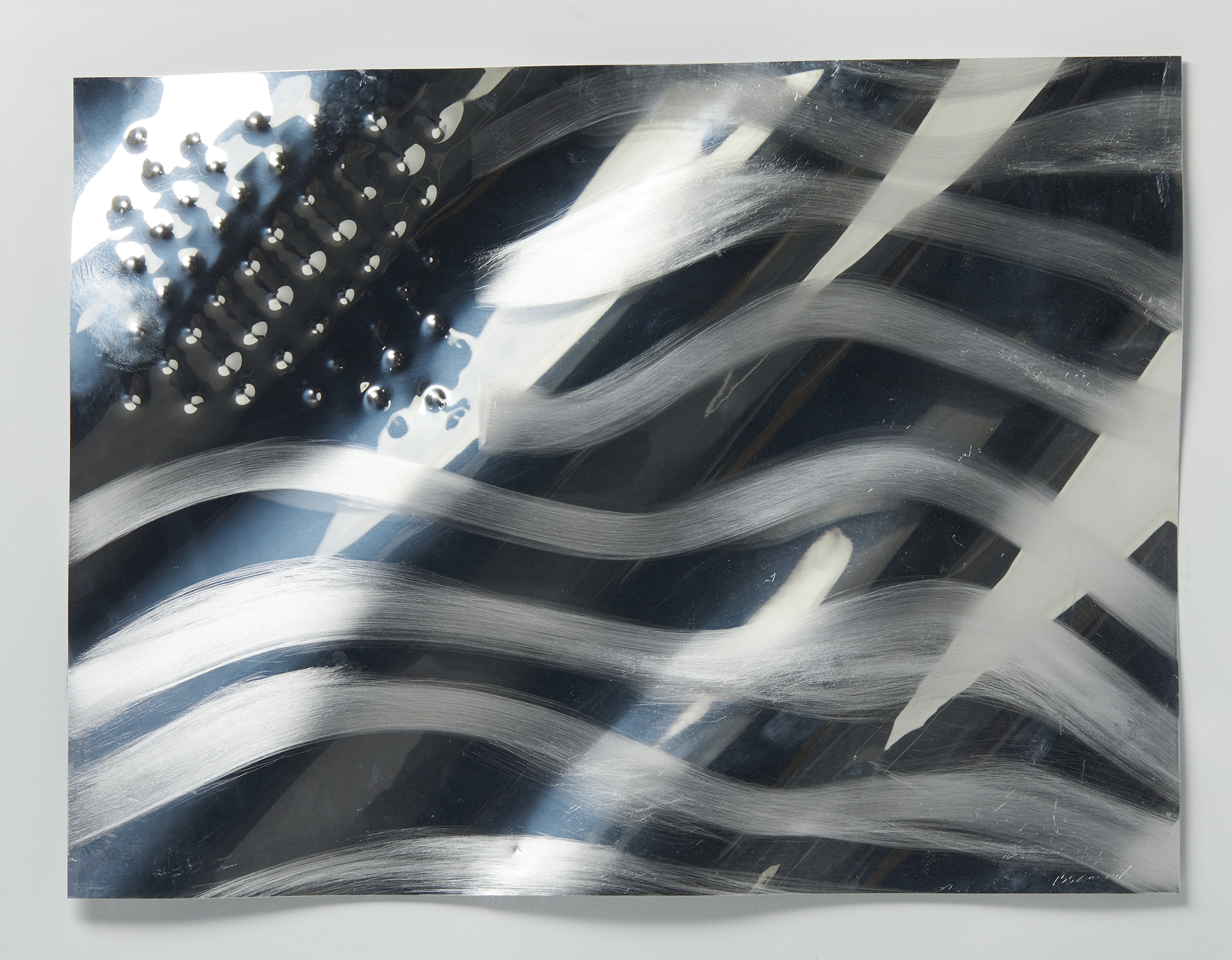 BRESCIANINI ANGELO (1948 - 2016) Bandiera. Lamiera. Cm 66,00 x 49,00. Firma incisa in basso a destra. Al retro timbro Minotauro Fine art gallery, Palazzolo e cartiglio del Catalogo Ragionato delle opere di Angelo Brescianini con relativo numero d'inventario. Autentica su fotografia di Antonio Falbo. Cornice presente