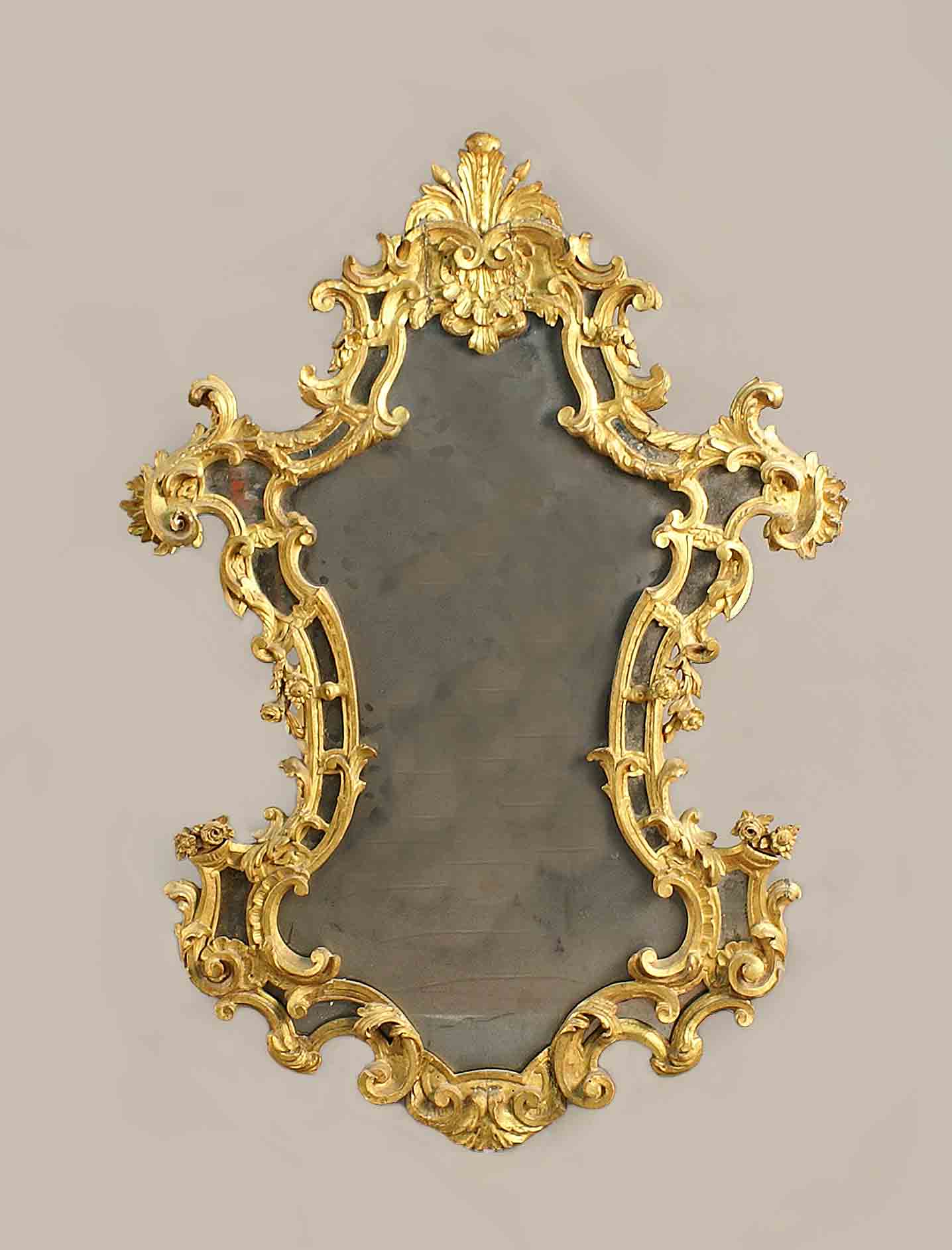 Specchiera con cimasa, cornice sagomata in legno dorato ed intagliata a motivo floreale e di volute, specchio al mercurio, Roma, XVIII secolo, cm. 120x86.