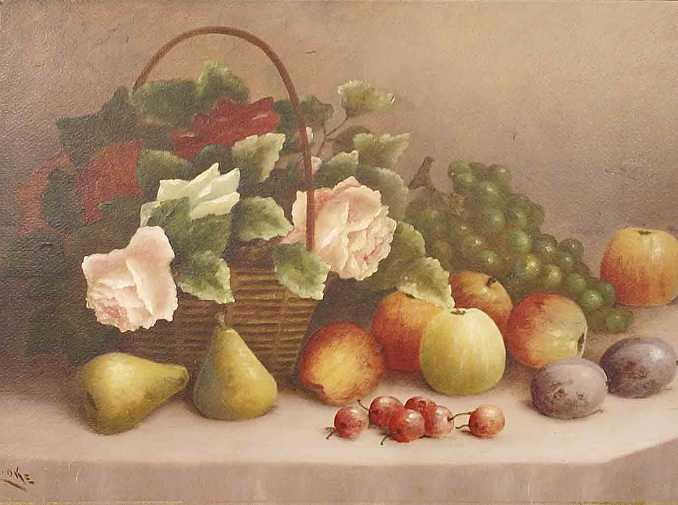 E. Oke (XX secolo), "Natura morta di frutta con cesto di fiori", olio su cartoncino, cm. 35x46, firmato in basso a sinistra.