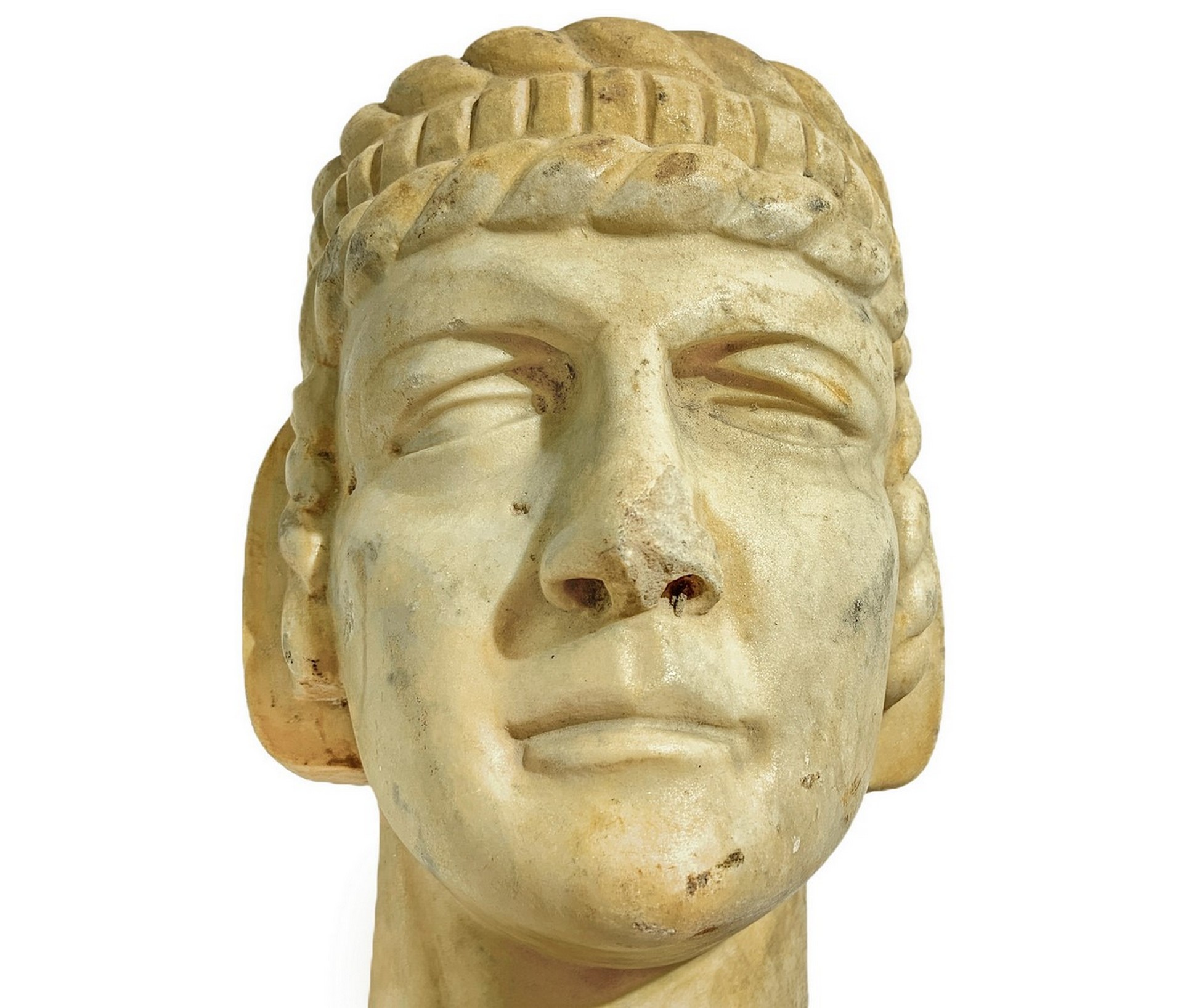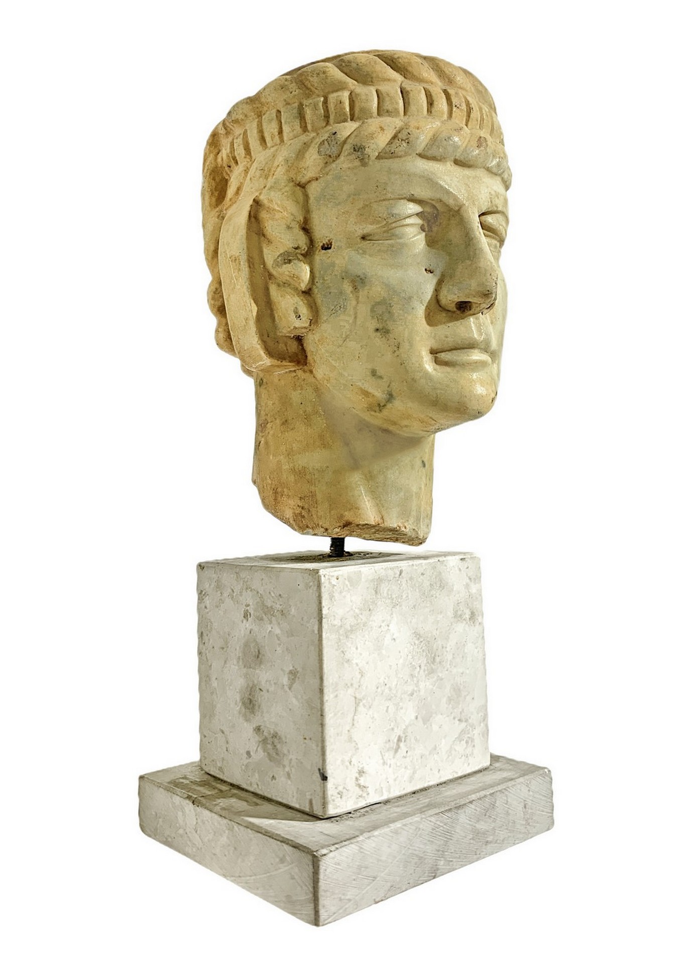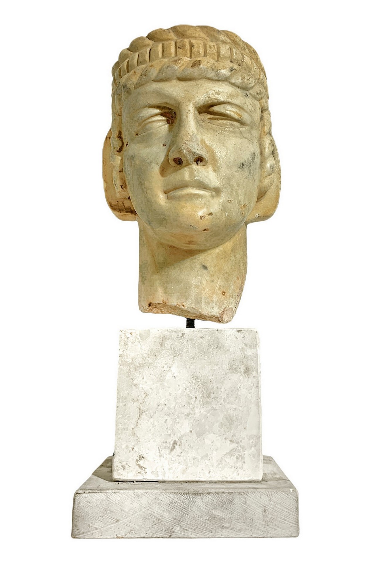 Testa in marmo bianco,, 14th/15° secolo H cm 21 x 15. Piccola mancanza al naso.