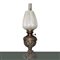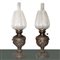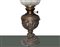 Coppia di lumi a petrolio con base in ottoe sbalzato a rilievo con motivi floreali, nineteen° secolo