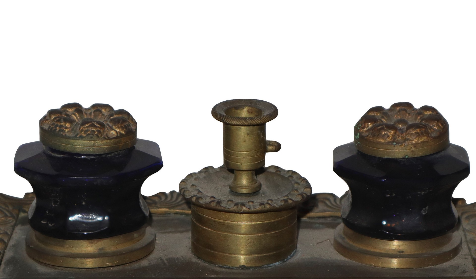 Calamaio in bronzo con portainchiostro in vetro, nineteen° secolo cm 24x13