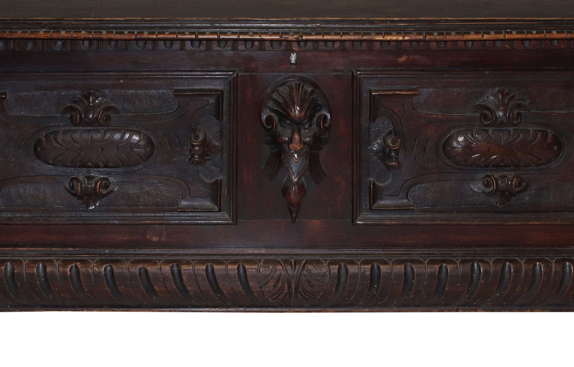 Cassapanca in stile rinascimento, Fine 19° secolo H 51 x L 150 x P 50 Piedi leonini, fronte con grottesche e conchiglie intagliate. Coperchio dentellato