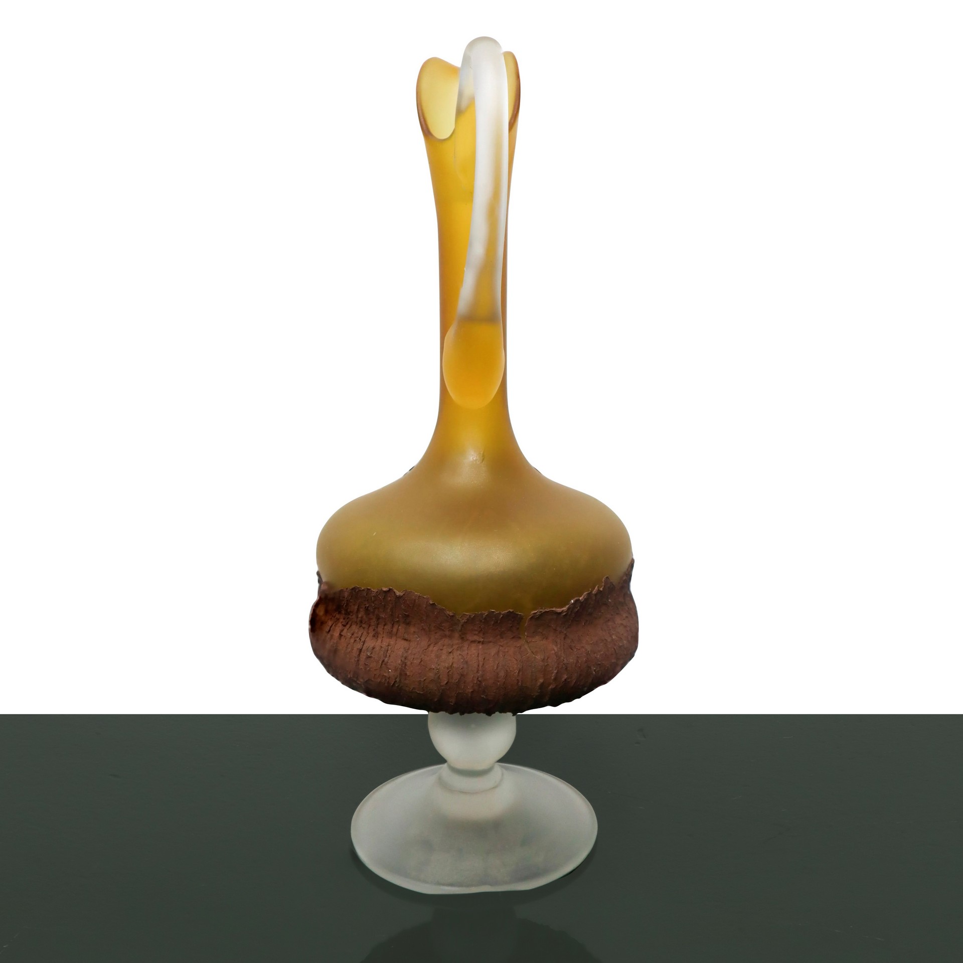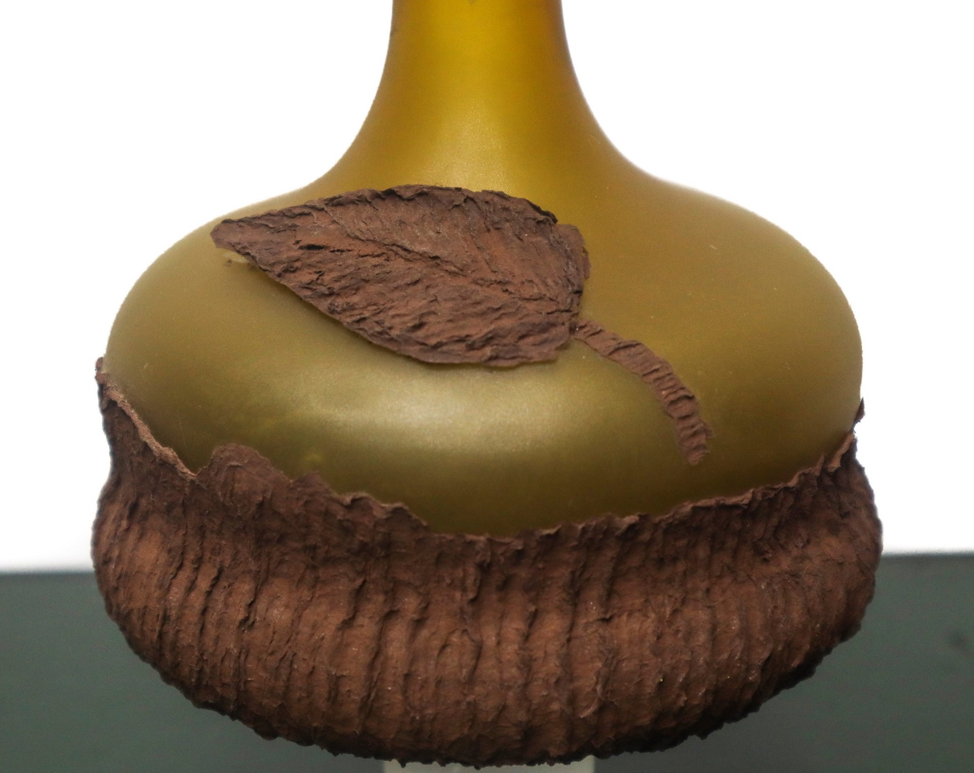 Vaso con manico in vetro con decorazione a foglia H cm 32, base cm 10 Base rotonda. Sbeccatura alla base