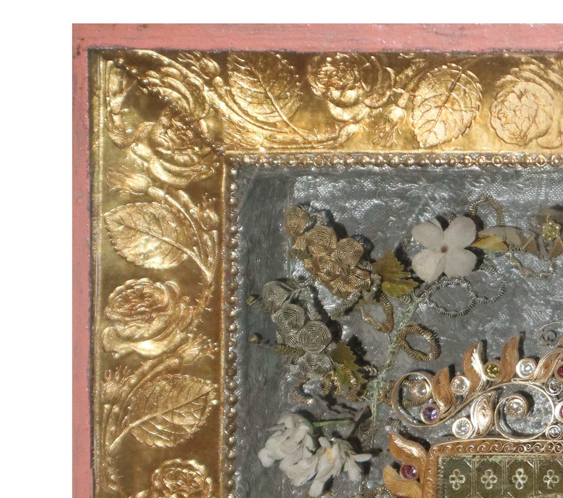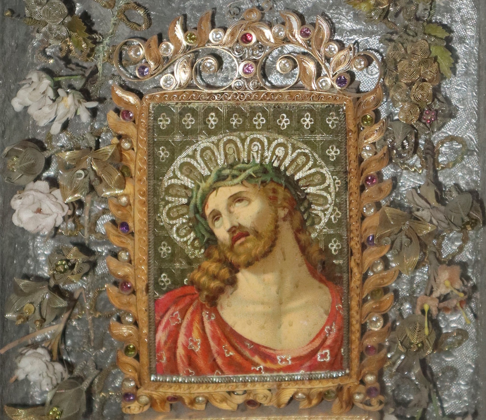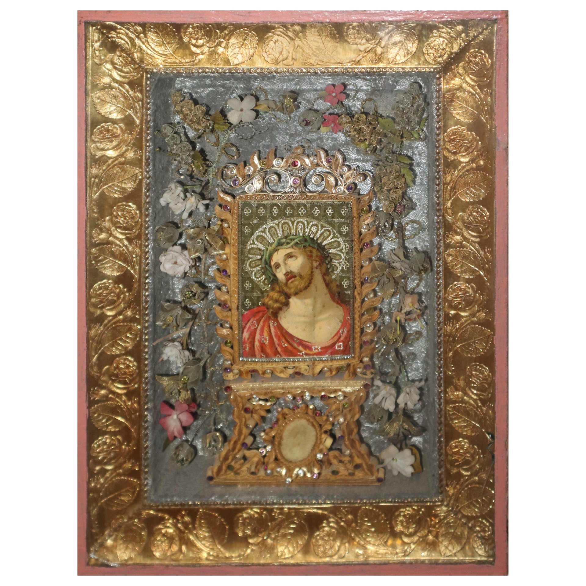 Capezzale in cornice dorata con immagine centrale Ecce Homo, Sicily 19° secolo Decorazioni ai lati in pietre dure colorate e stilemi floreali.