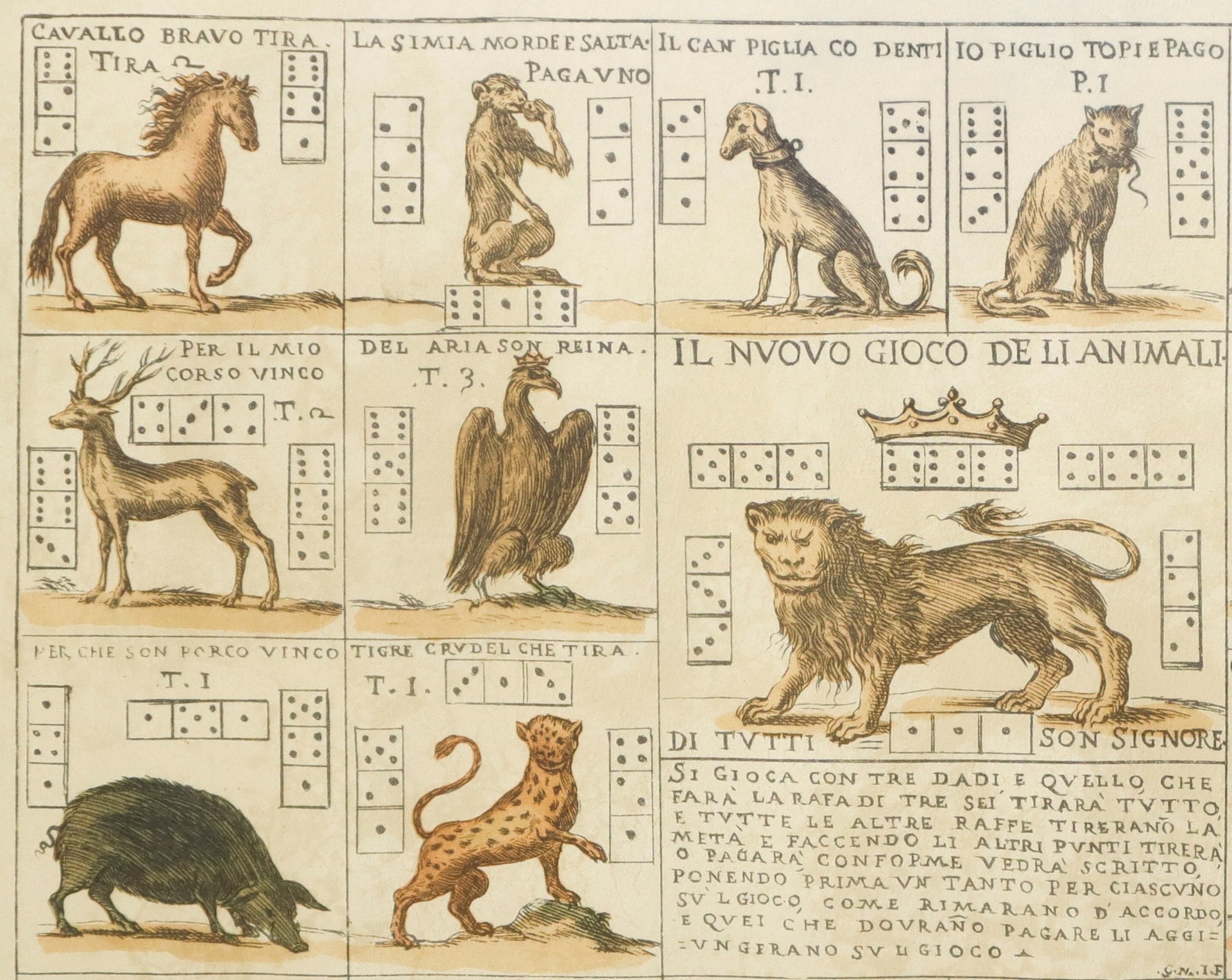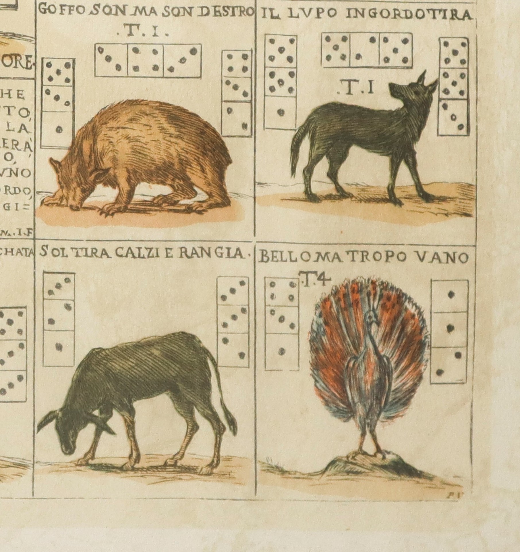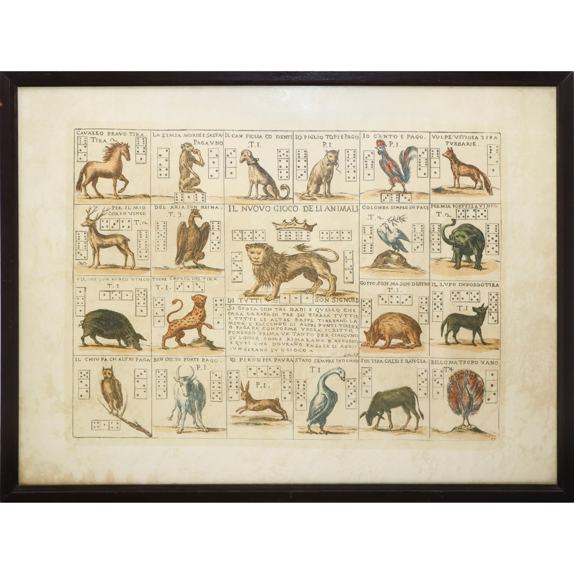 Il nuovo gioco degli animali, 19° secolo H cm 31 x 42, in cornice h cm 41,5 x 52 Incisione all'acquaforte Ristampa dal gioco a dadi creato da Giuseppe Maria Mitelli ( 1690-1718 )