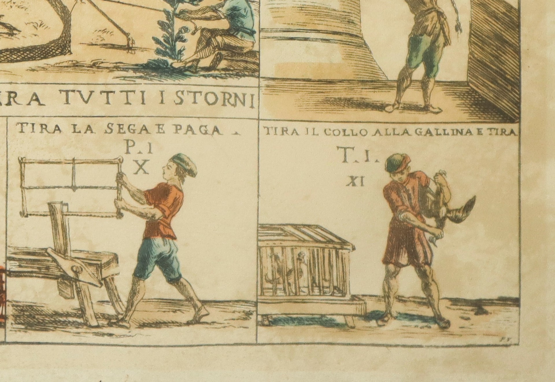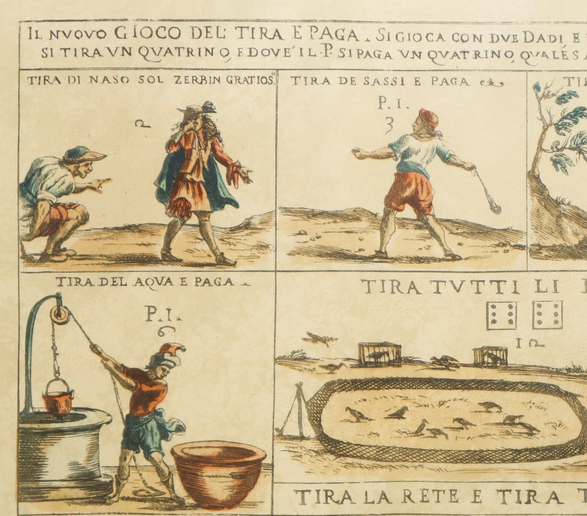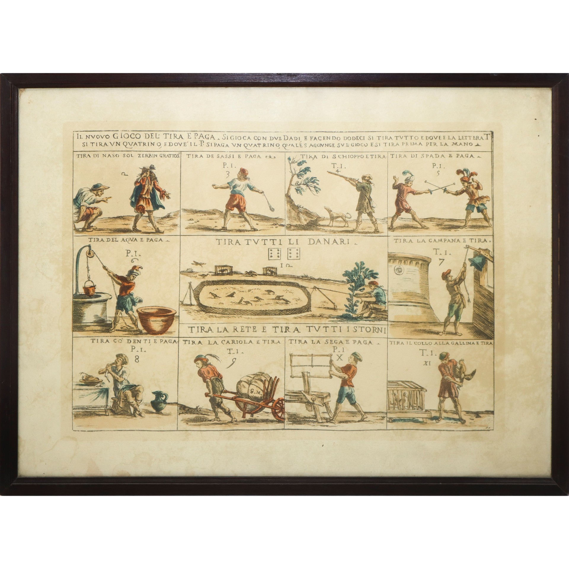 Il nuovo gioco del tira e paga, 19° secolo H cm 31,5 x 42, in cornice 41,5 x 52 Incisione all'acquaforte Ristampa dal gioco a dadi creato da Giuseppe Maria Mitelli ( 1690-1718 )