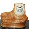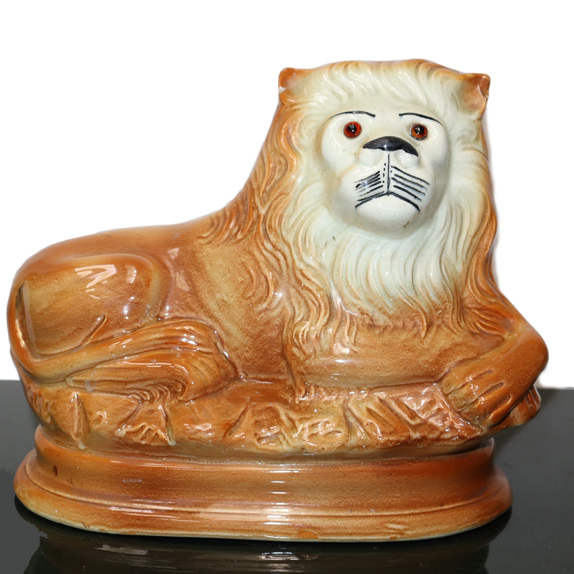Leone in maiolica con occhi vitrei H cm 25 base cm 28 Minime sbeccature sulle orecchie