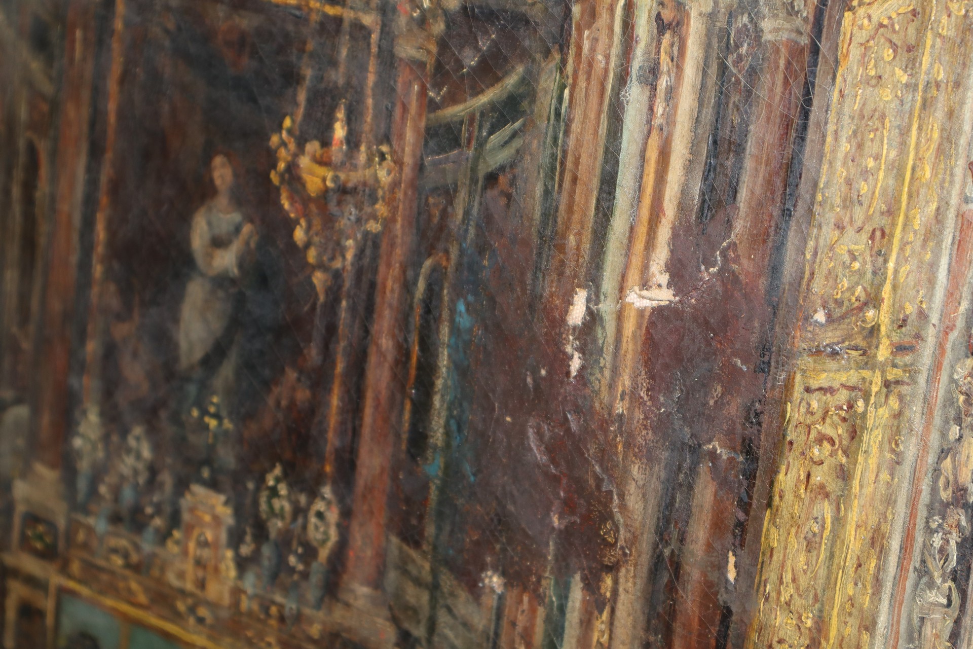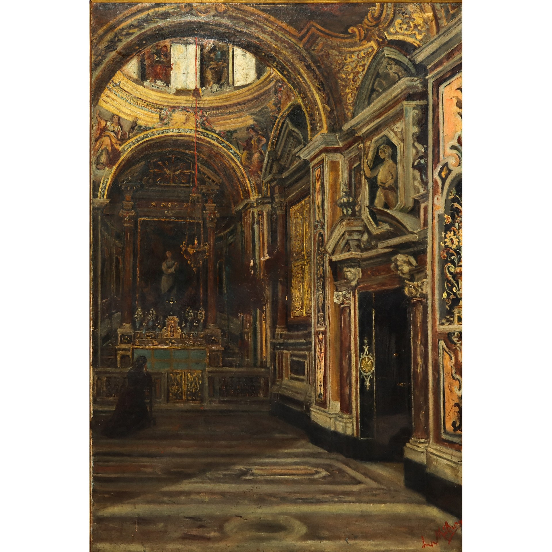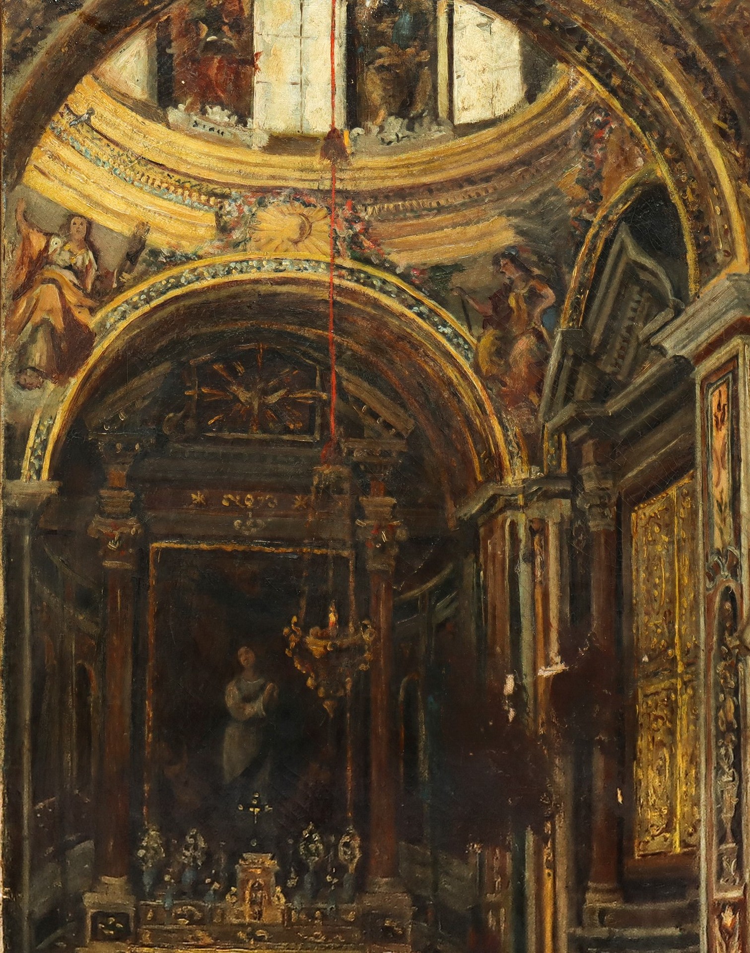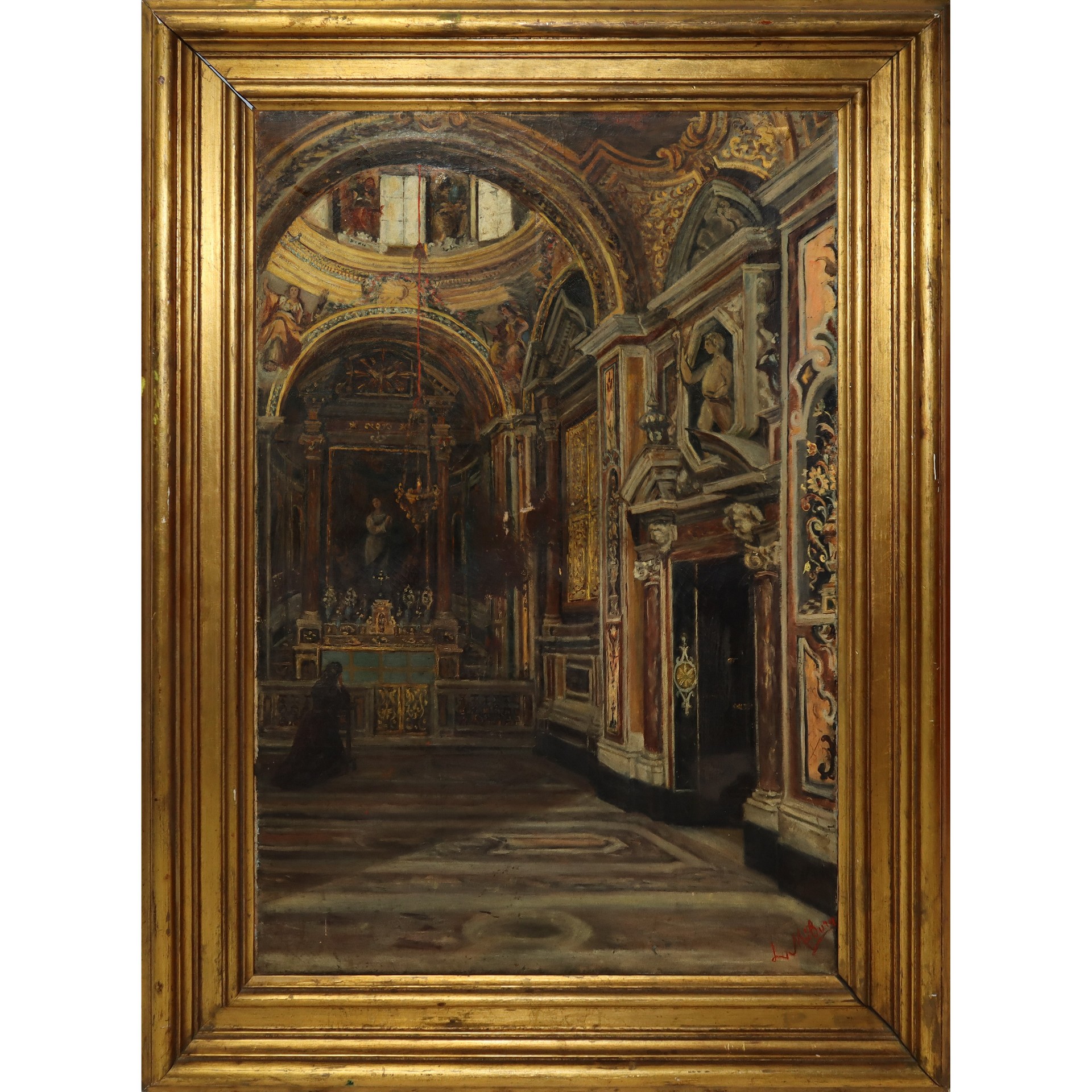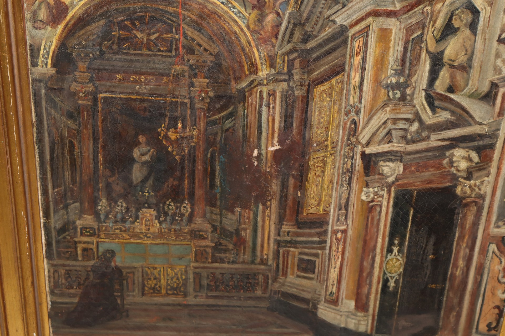 Interno di Chiesa, 19° secolo Cm 80x53, in cornice cm 99x72 Dipinto ad olio su tela Piccoli tagli e restauri. Firmato in basso a destra
