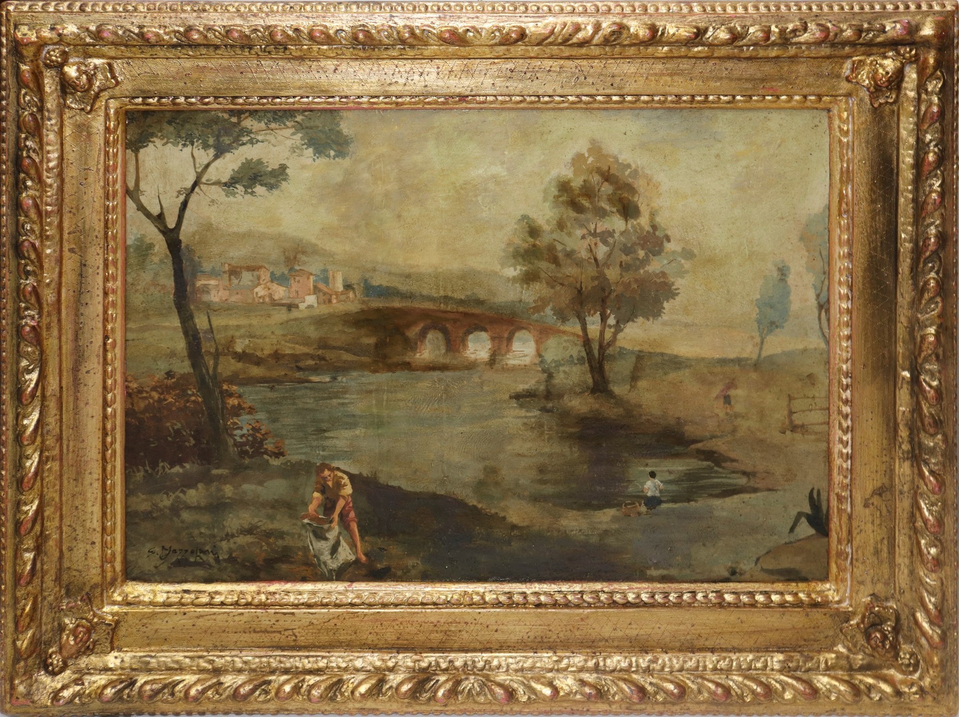Giuseppe Mazzolani (1842-1916) - Paesaggio con figure Cm 54x80, in cornice cm 76x 101 Dipinto ad olio su legno Firmato in basso a sinistra. Certificazione per autentica della Galleria Magnolia Arte , Milano