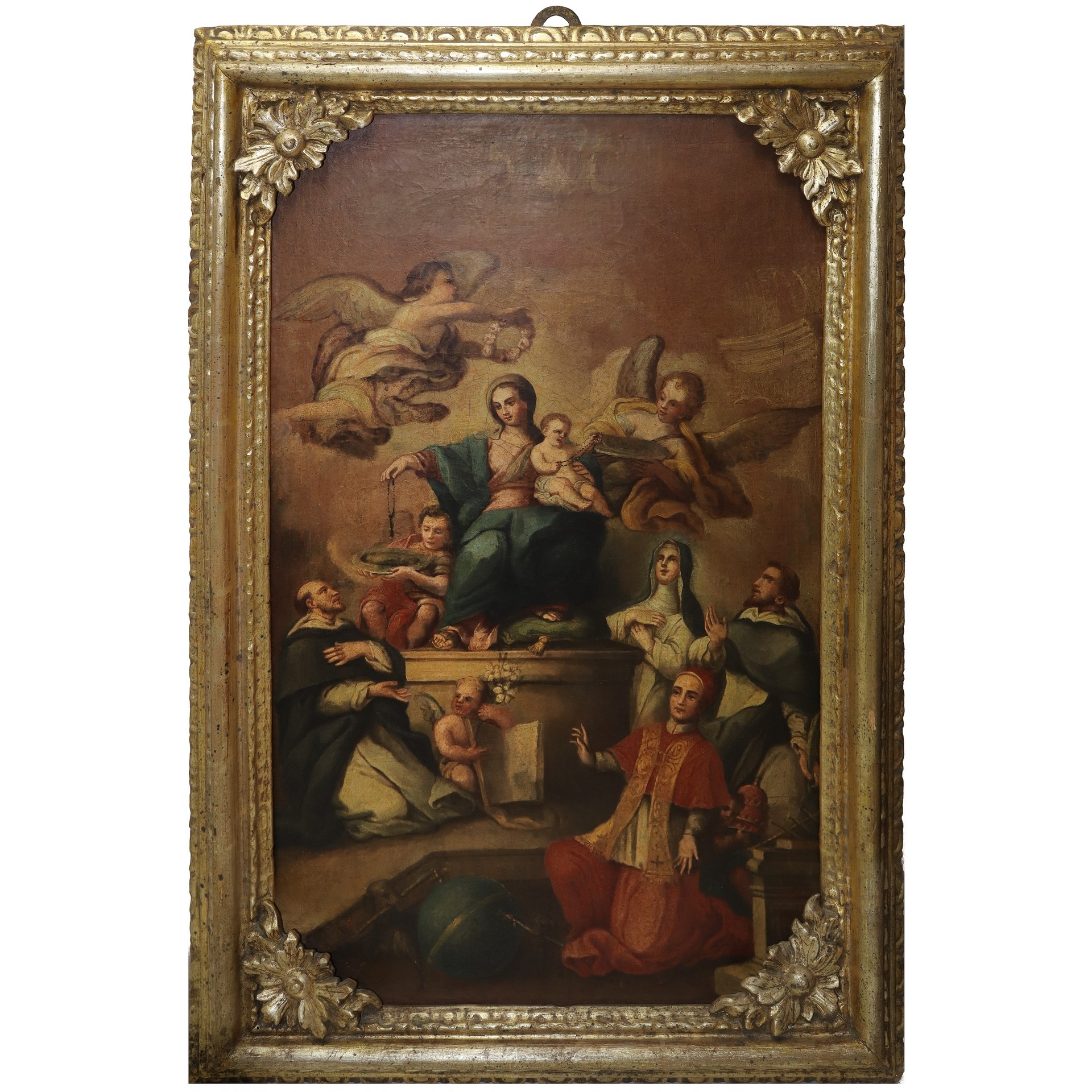 Madonna del rosario con bambino Gesù, angeli e santi, Sicilian painter Fine 18th/Primi 19° secolo Cm 100 x 63, in bellissima cornice legno dorato cm 115 x 78 Olio su tela