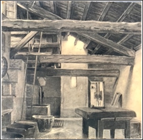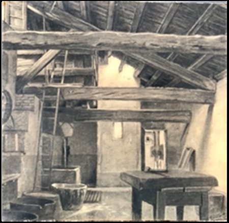 ENRINI GIUSEPPE Milano 1899 - 1962 "Interno" Carbone su carta incollata su cartone cm 47x45,7. Firmato sul fronte in basso a destra.