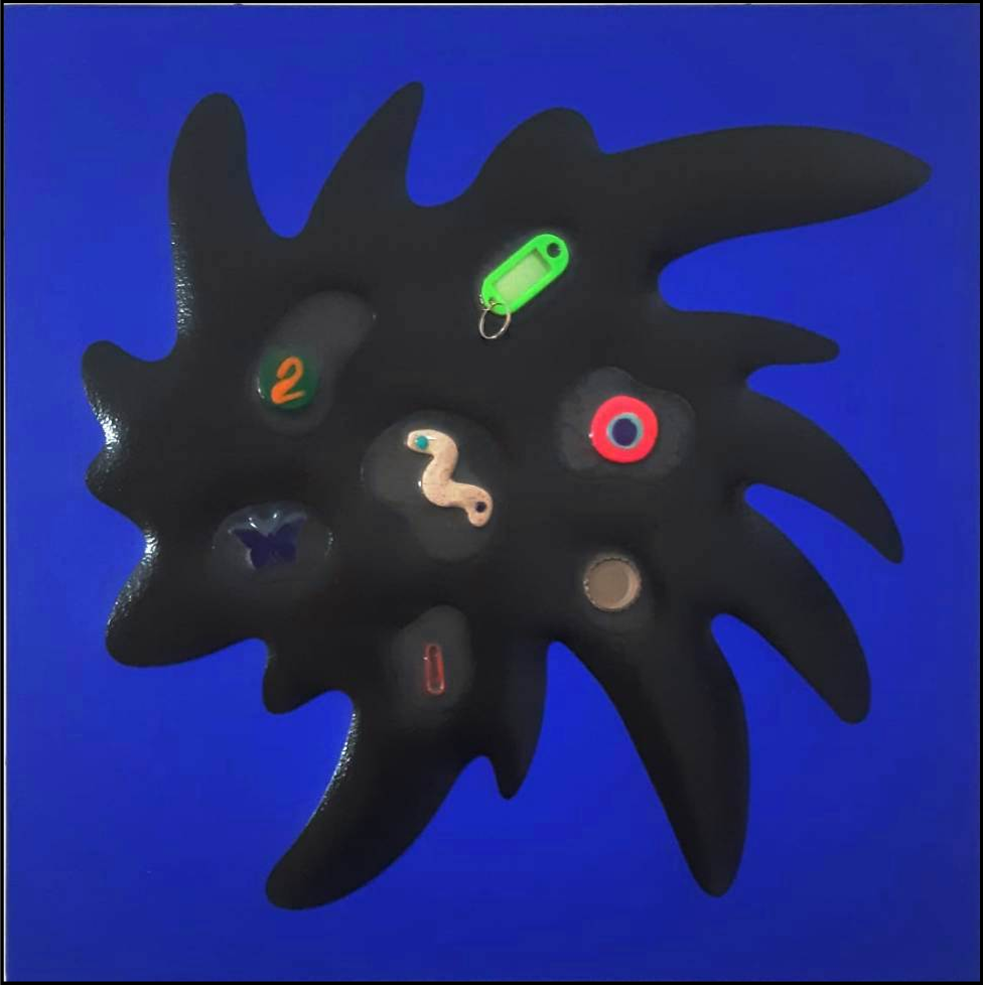 NUCARA RENZO Crema 1955 "Bang 10-37" Legno, carta, colore serigrafico, resine e oggetti, cm 50x50 del 2011. Firmato, datato e descritto al retro. Autentica ed archiviazione su foto a cura dell'artista.