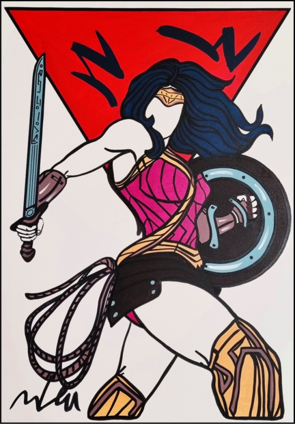 LODOLA MARCO Dorno 1955 "Wonder Woman" Acrilici e smalti su tela cm 70x100 del 2019. Firmata sul fronte in basso a sinistra e sul retro. Opera archiviata, autentica su foto.