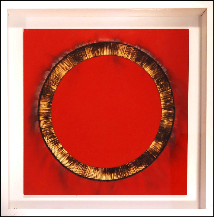 AUBERTIN BERNARD Francia 1934 - Germania 2015 "Dessin de feu circulaire" Fiammiferi bruciati su tavola rossa, cm 60x60, del 2008, esemplare unico. Sul retro firmato e datato. Archivio su foto a cura dell'Archivio delle opere di Bernard Aubertin.