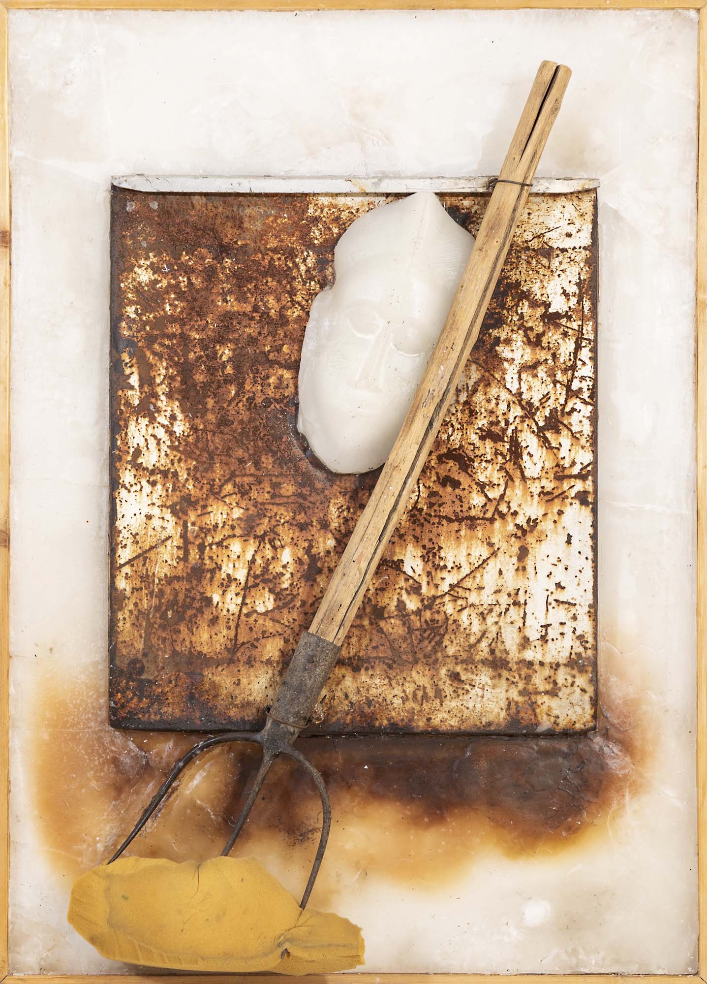 assemblaggio di cera, forcone, schiuma poliuretano e ferro su tavola cm. 103x73x10