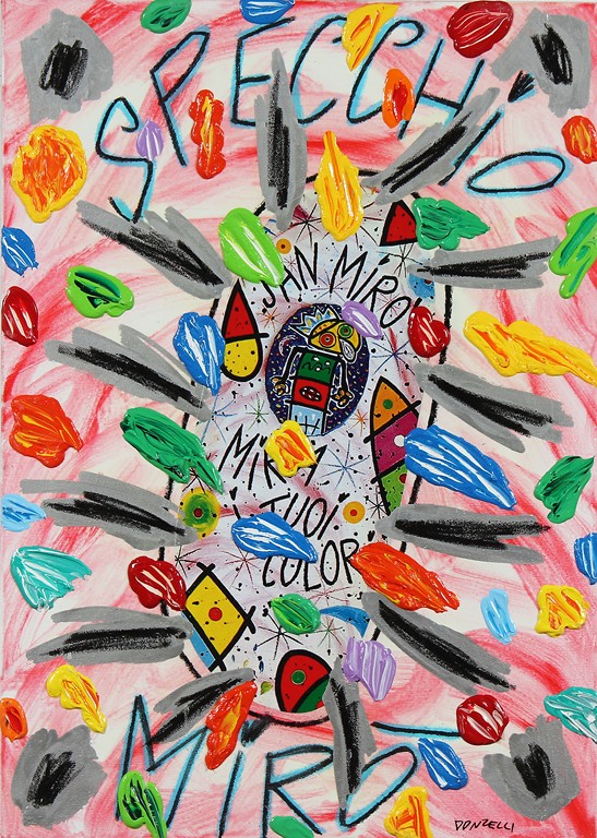 DONZELLI BRUNO (n. 1941) Specchio Mirò. Tecnica mista su tela. Cm 50,00 x 70,00. Firma in basso a destra. Al retro titolo e firma, Autentica dell'artista su fotografia.
