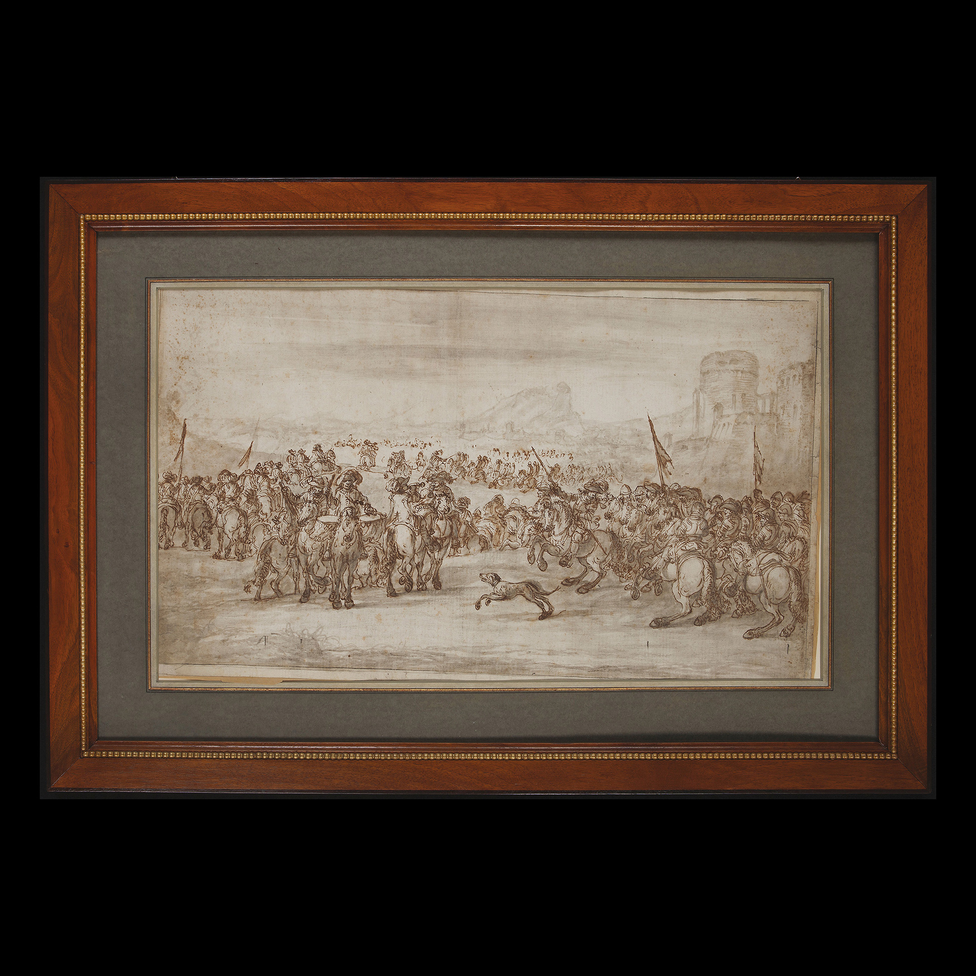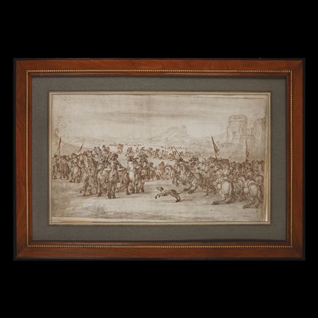 Questa tecnica mista su carta è un pregevole esemplare di bozzetto preparatorio di un importante pittore di battaglie del primo Settecento veneziano. Francesco Simonini nasce e si forma a Parma nella bottega di Francesco Monti detto il Brescianino delle Battaglie, ma le costruzioni delle sue composizioni risentono anche delle ampie vedute affollate da lotte fra cavalieri di Ilario Mercanti, detto lo Spolverini.Si stabilisce a Venezia e lì diventa il più famoso rappresentante del genere, ottenendo commissioni di rilievo quali quelle di uno dei più noti collezionisti della contemporanea pittura veneziana, il conte Johann Matthias von der Schulenburg.Il pittore trascorse alcuni anni anche tra Firenze, Roma e Bologna, prima di trasferirsi a Venezia dove lavorò per altri importanti committenti: i Piccolomini a Firenze, il cardinale Ruffo a Bologna e svariati cavalieri e cardinali a Roma. Capire a quale fase della sua produzione appartiene questo disegno non è compito semplice: quello che però possiamo affermare con certezza è che si tratta di un pezzo di grande qualità che, accanto alla vaghezza del paesaggio e delle architetture dello sfondo, alterna il disegno preciso, vibrante, nervoso, fortemente espressivo; caratteristiche che ritroviamo anche nella sua produzione pittorica. Bibl.: G. Sestieri, I pittori di battaglie, Maestri italiani e stranieri del XVII e XVIII Secolo, Roma 1999, pp. 456-479.. Inchiostro e acquerello su carta, cm est. 63x92, int. 40X69.5