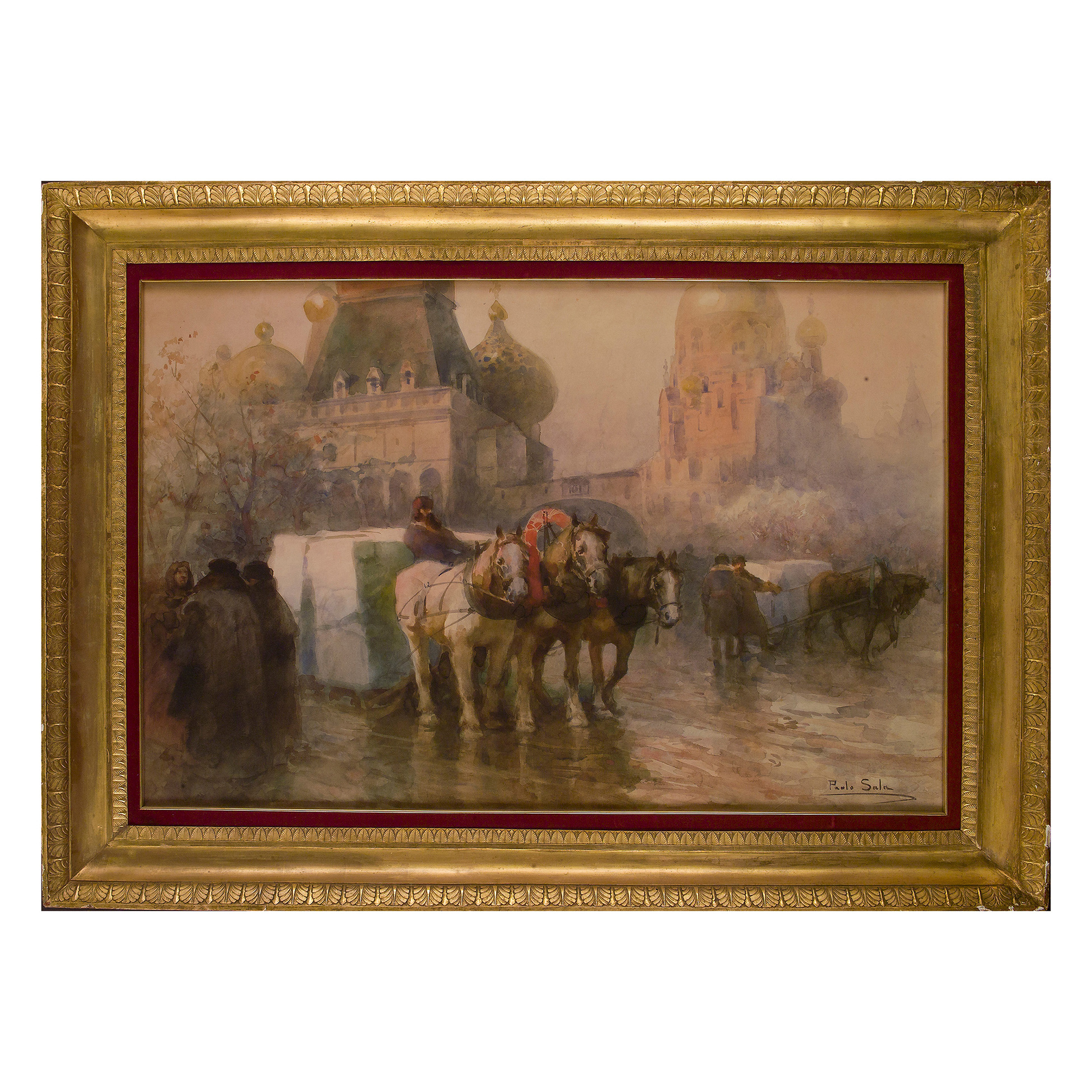 Abilissimo acquerellista, Paolo Sala si forma presso l'Accademia di Brera. Viaggiò in Francia, in America e in Russia, dove soggiornò a lungo; a questo periodo si deve la produzione della nostra opera. Firmata in calce dall'artista, nelle eleganti architetture dello sfondo riconosciamo la città di Mosca, e nel soggetto dei trasportatori di ghiaccio, una volontà di catturare, con tono tanto romantico quanto cronachistico, l'atmosfera quotidiana della scena. La densità dell'atmosfera fredda, nevosa e piena di foschia è resa in maniera eccellente dal mezzo dell'acquerello, reso di una raffinatezza associabile quasi pari a quella della pittura ad olio.. Acquerello su cartone, dimensioni ext. 86x119,5 int. 66x101 cm.