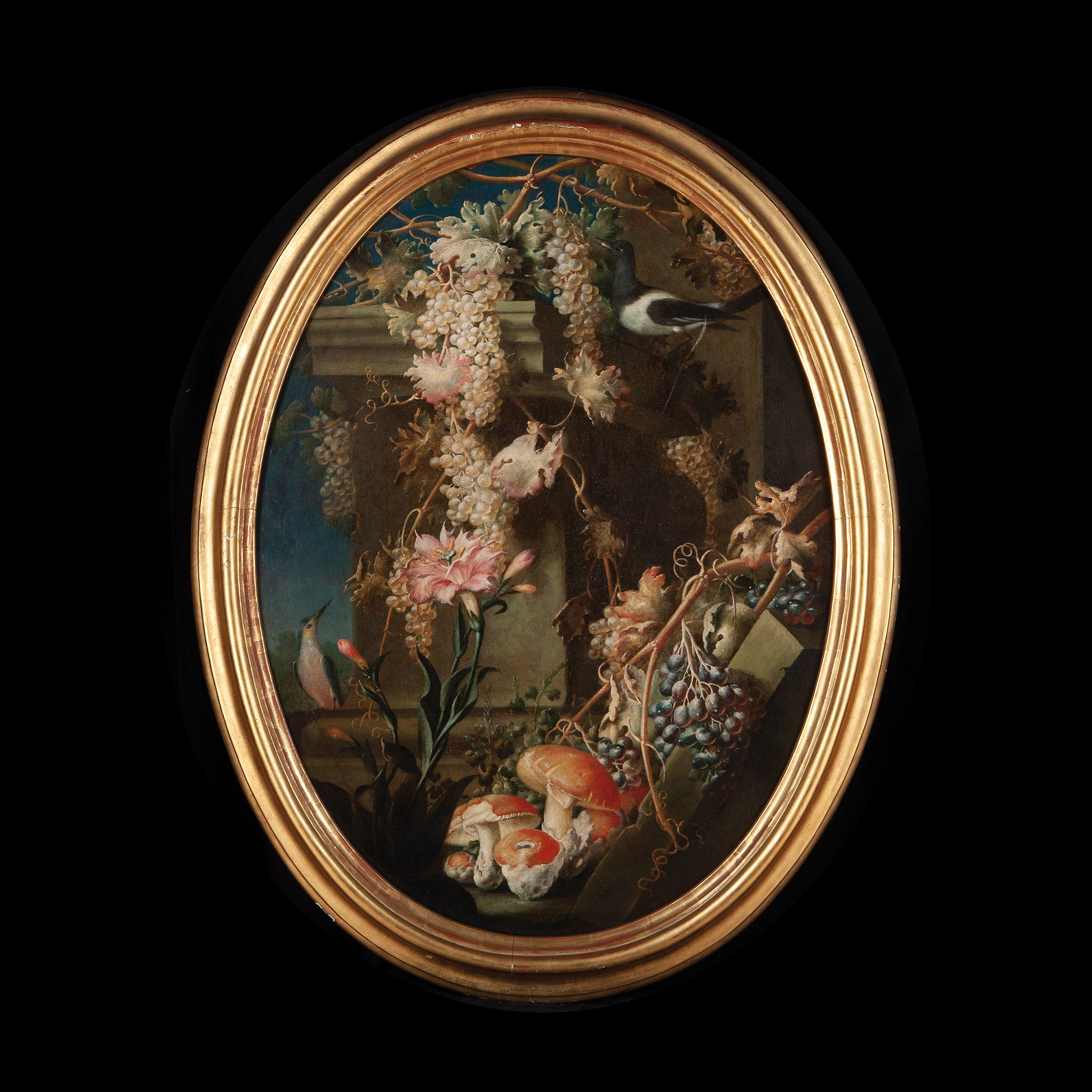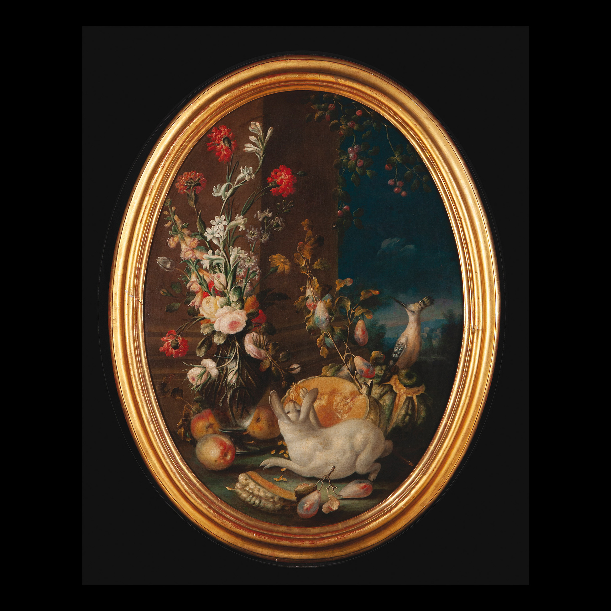 Questo pendant del pittore modenese Felice Rubbiani raffigurante una coppia di nature morte con fiori, frutta e animali, sono il perfetto esempio che la pittura tardo barocca fa di questo genere: sebbene sia rimasta la volontà di rendere fede al dato naturale e di descrivere con precisione il vero, questa attenzione è vissuta nella sua produzione in maniera meno analitica, più leggera. I tozzi basamenti in pietra fanno da contrappunto alla ricca ma delicata cascata di vegetali che scendono verso il basso. I colori sono morbidi, brillanti e ben si sposano col paesaggio scuro dello sfondo.Del pittore non sappiamo molto: la sua formazione è avvenuta a Bologna sotto il naturamortista Domenico Bettini, che a sua volta era stato apprendista di Jacopo Vignali a Firenze e di Mario Nuzzi durante un breve soggiorno romano. Da questo background è possibile desumere le influenze assimilate dal Rubbiani che, unite al suo stile leggero e grazioso, lo avvicinano molto ad uno spirito tipicamente Rococò.Bibl.: M. Dugoni, in La natura morta in Emilia e in Romagna, a cura di D. Benati e L. Peruzzi, Milano 2000, pp. 233 – 239.. Olio su tela, cm est. 117x90.5, int. 101X76