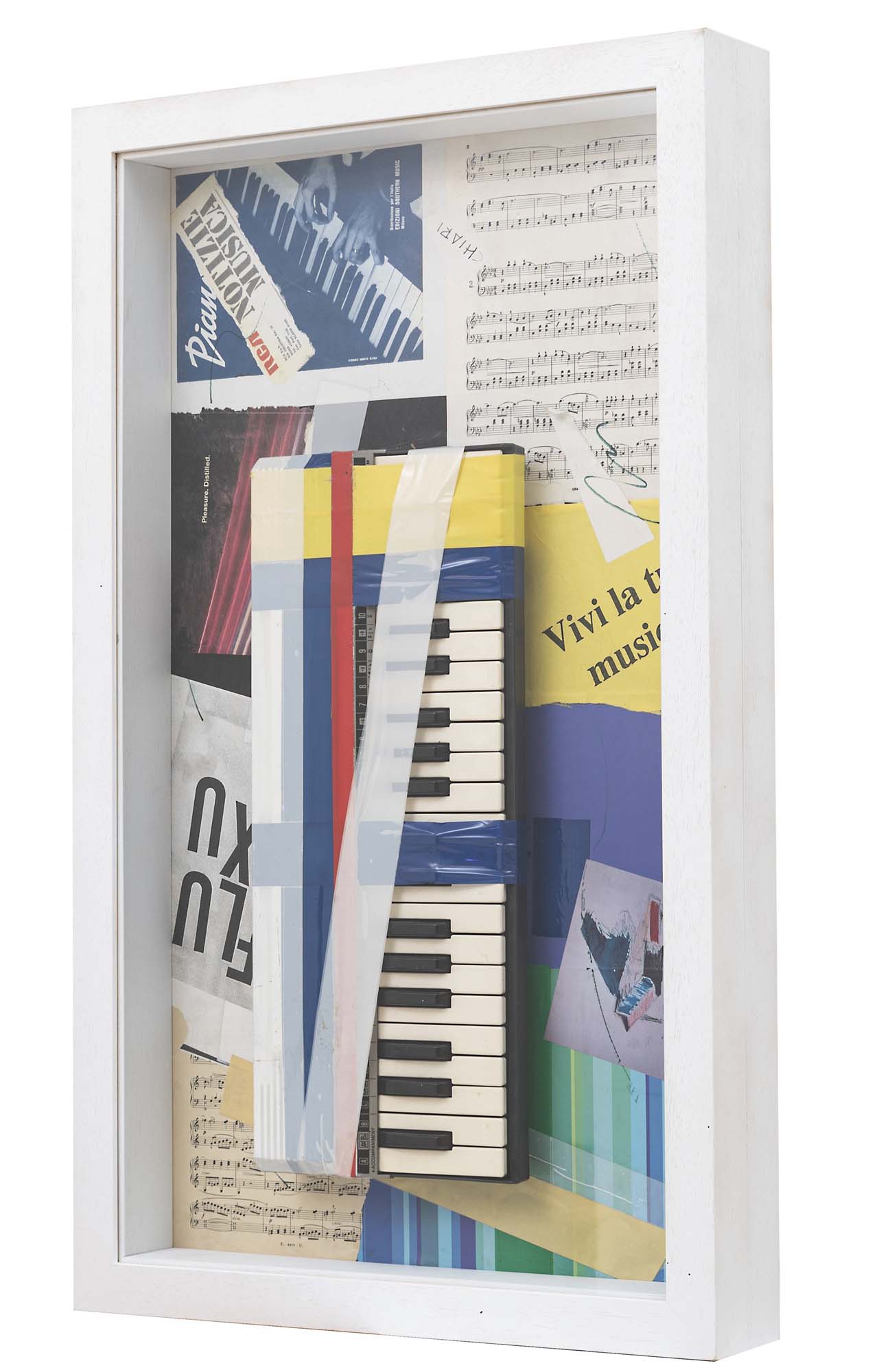 tecnica mista, collage e applicazione di strumento musicale su tavola entro teca cm. 90x50x11