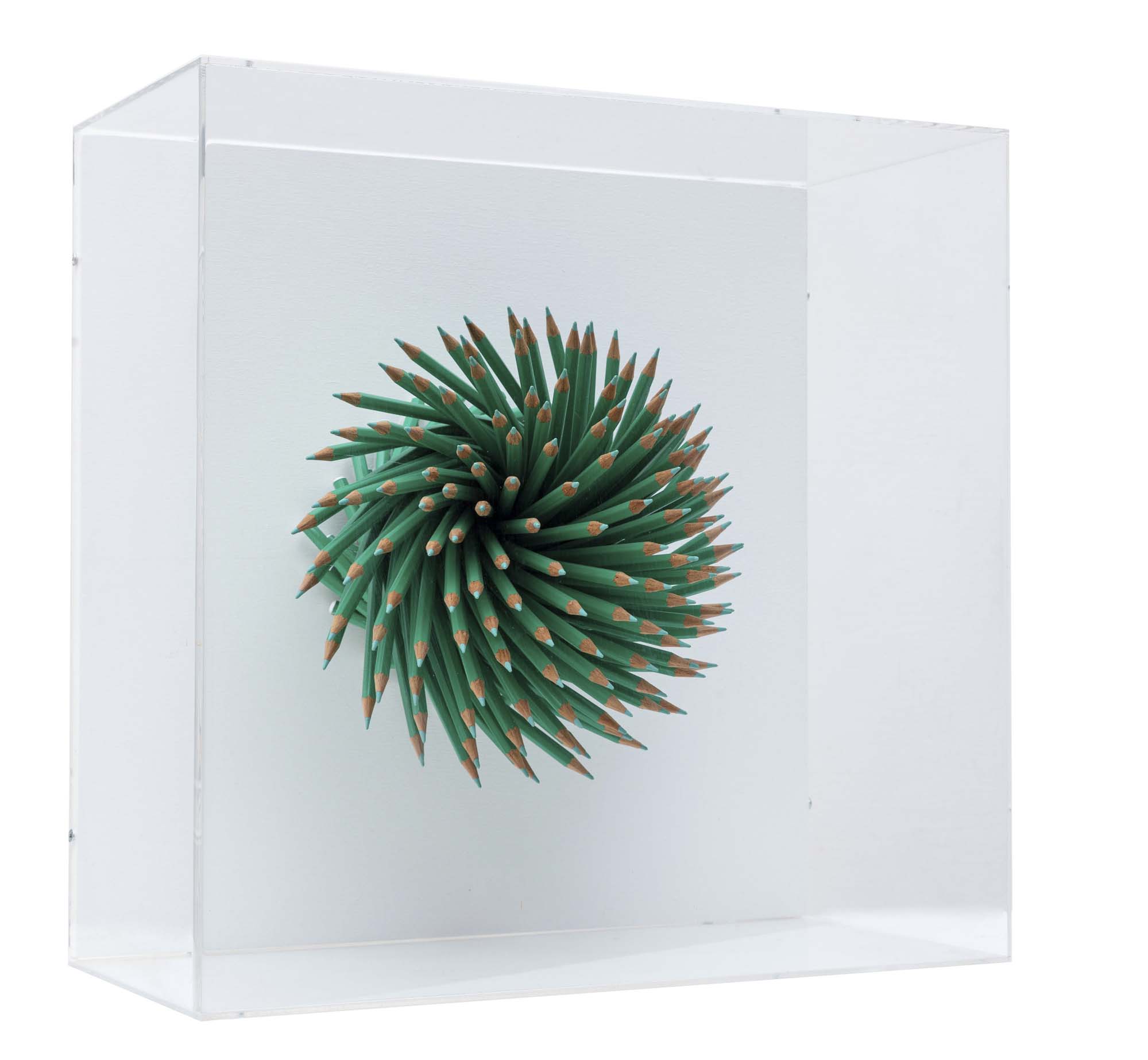 assemblaggio di matite entro teca in plexiglass cm. 40x40x20