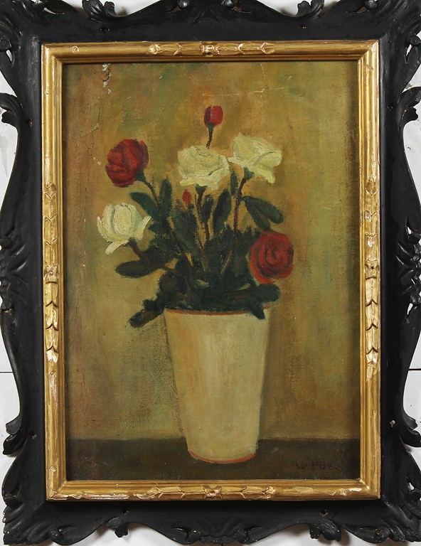 POZZI WALTER (1911 - 1989) Natura morta. Olio su tela . Cm 50,00 x 70,00. Firma in basso a destra. Presenta perdite di materia. Cornice presente