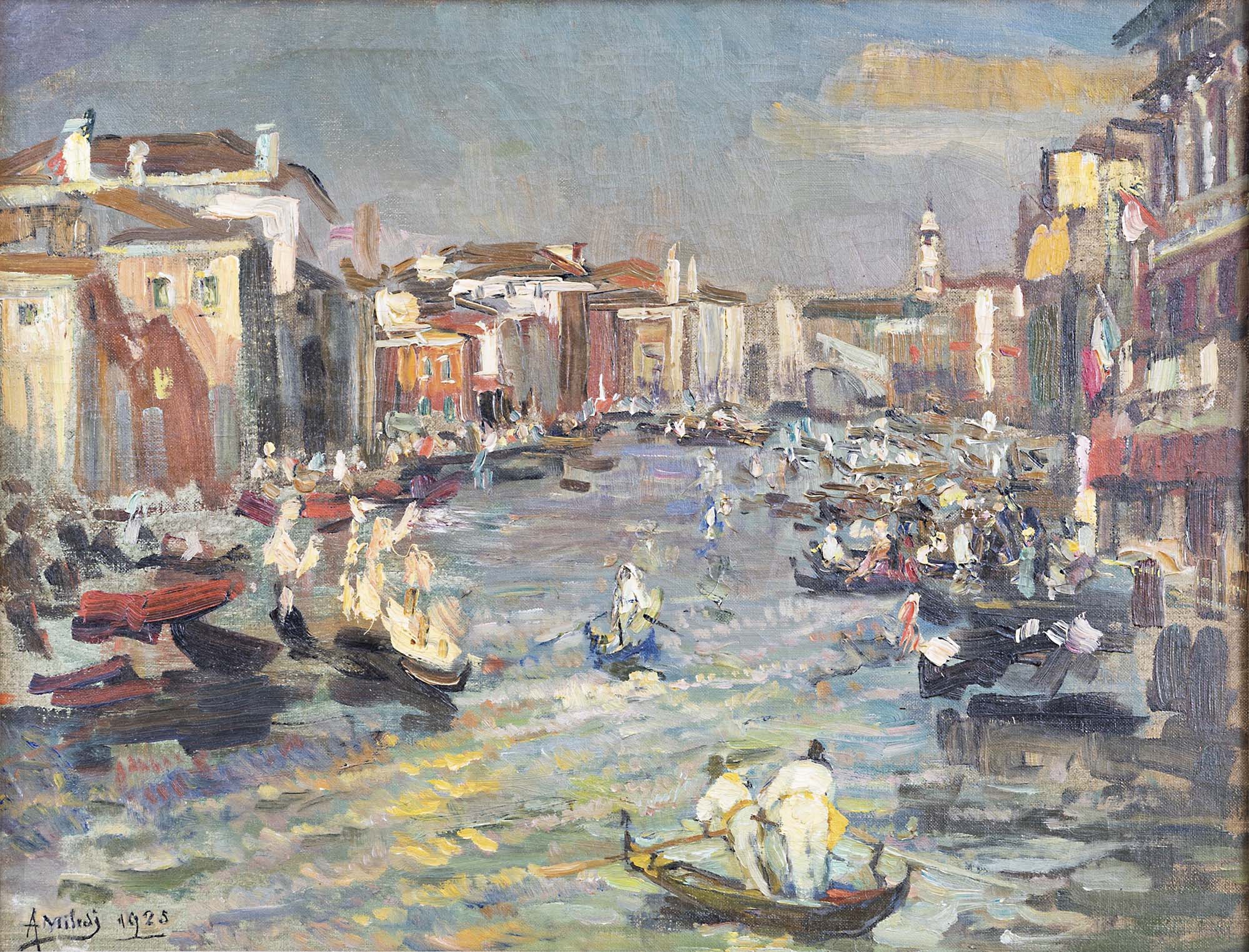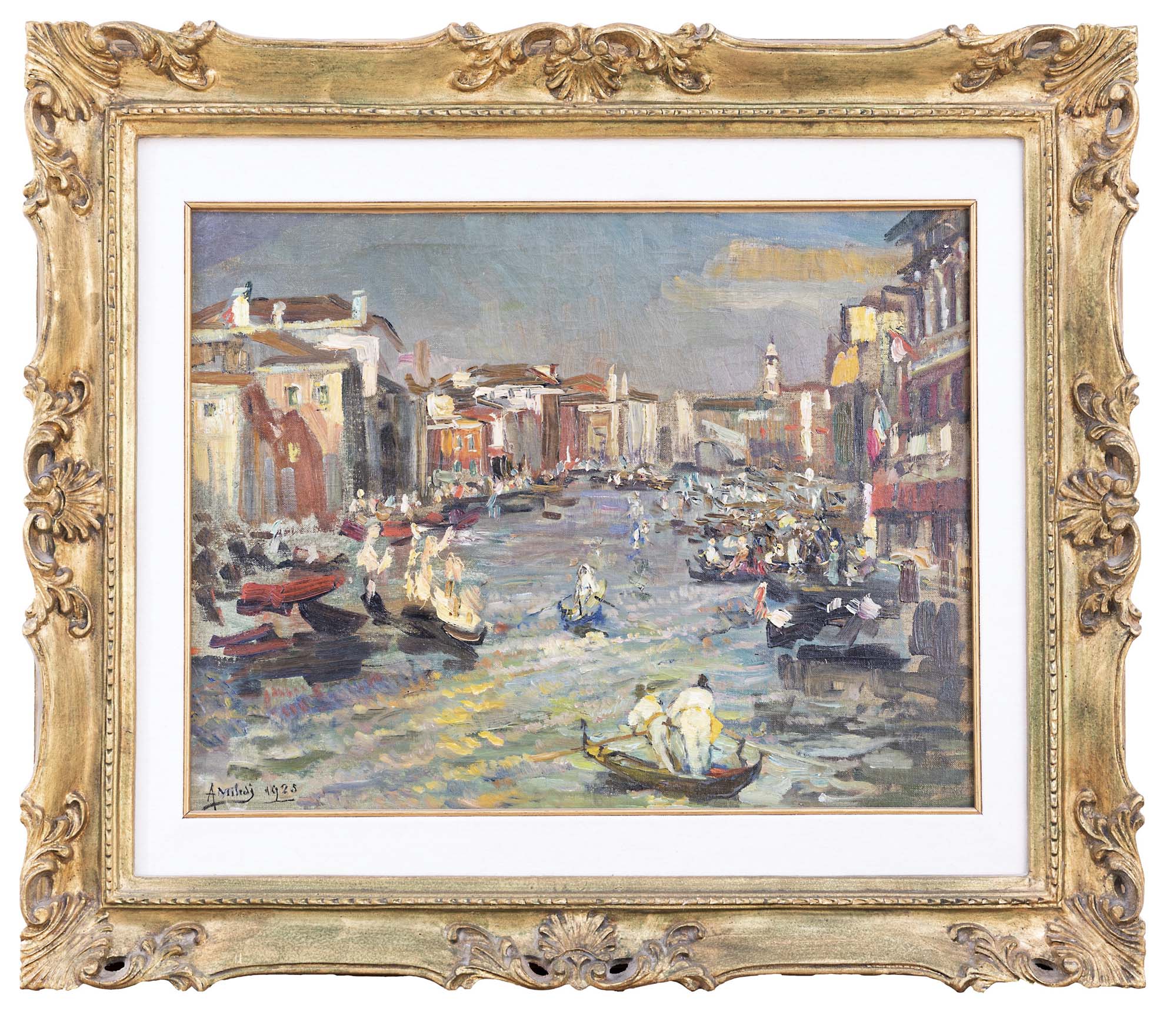 ALESSANDRO MILESI (Venezia, 1856 - 1945) Gondole nel Canal Grande a Venezia...