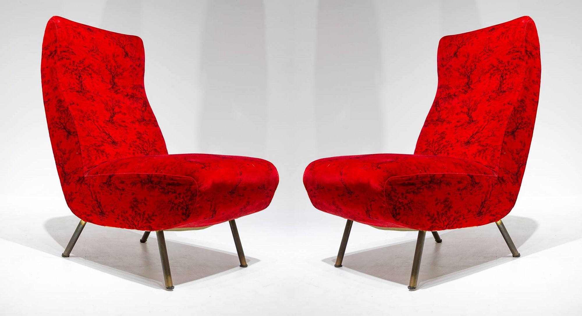 Lot 19 | Zanuso per Arflex - Coppia di poltrone Mod. Triennale, tessuto rosso originale probabile Fede Chieti.