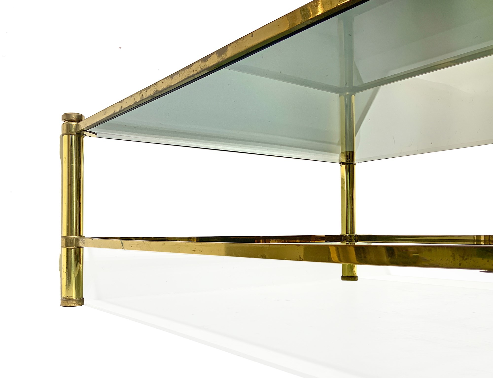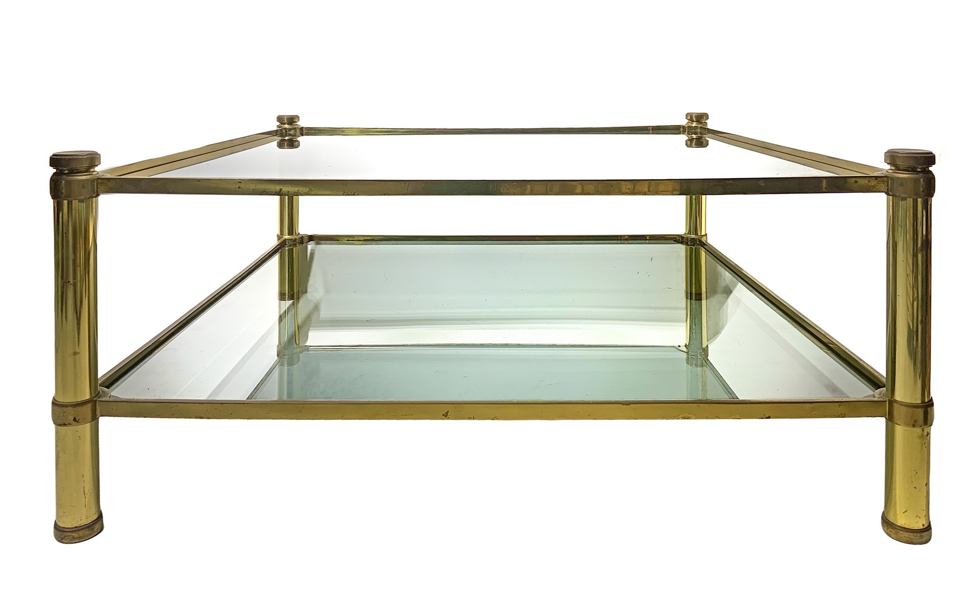 Tavolo da caffè nello stile di Romeo Rega, 70's 1,02x1,02 m Struttura in ottone dorato, piano in vetro color nero. Presenti segni d’uso.